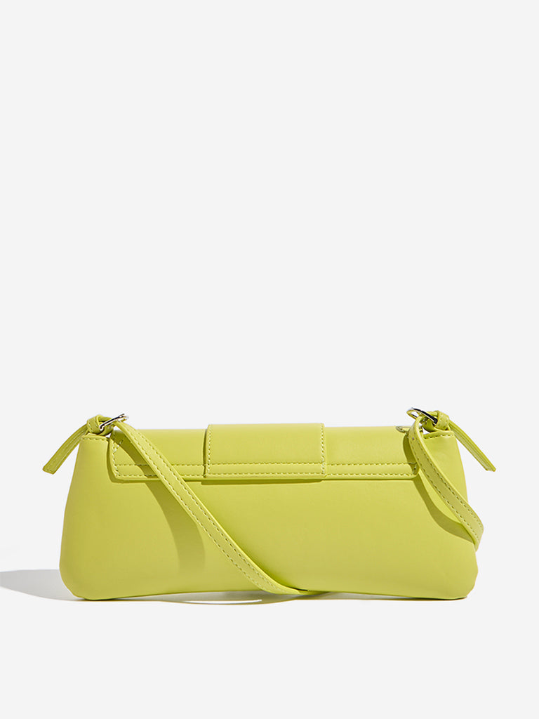 Add a chic edge to your look with this lime baguette bag from Westside. Crafted from faux leather. its compact design is elevated with stitched detailing on the exterior. The front flap is adorned with two decorative silver-toned buckles for a stylish touch. while the attached handle features an adjustable buckle for a customized fit. The single main compartment offers ample space for effortless storage.