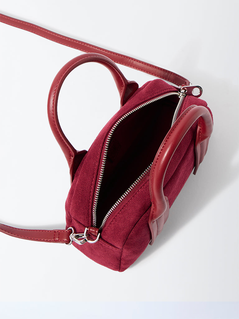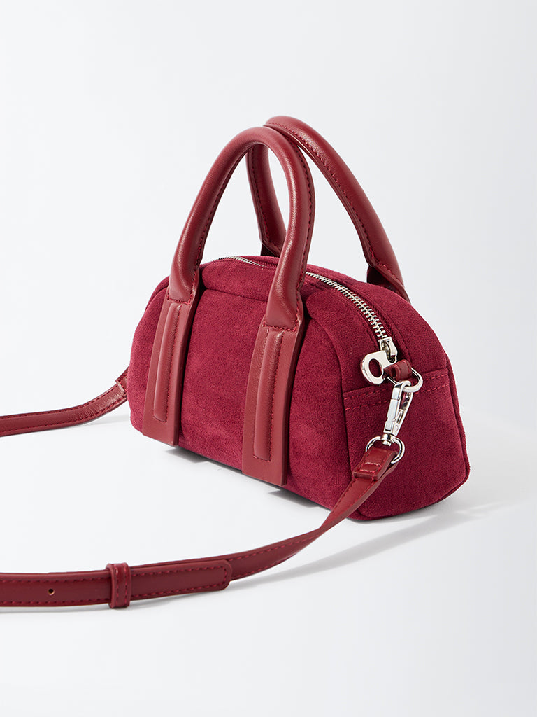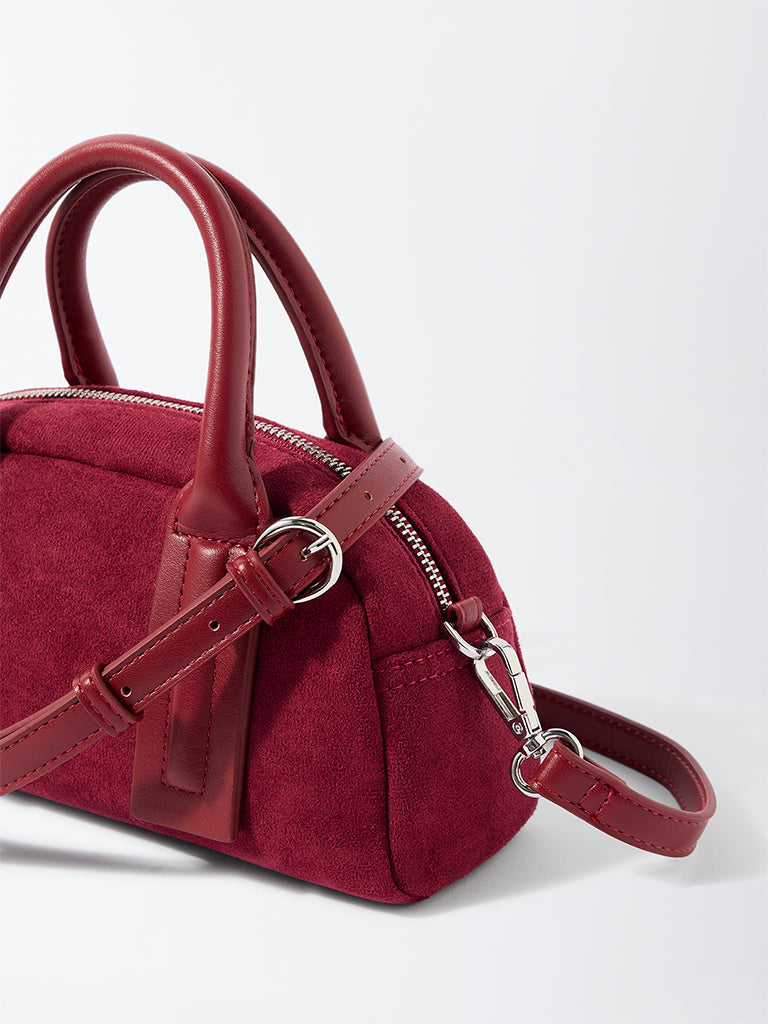 Westside presents this maroon bowling bag. crafted in rich faux suede for a touch of understated elegance. Designed with dual top handles and a detachable long strap. it offers versatile carrying options. The spacious main ziplined compartment provides ample room for your essentials. making it a stylish and functional pick for everyday use.