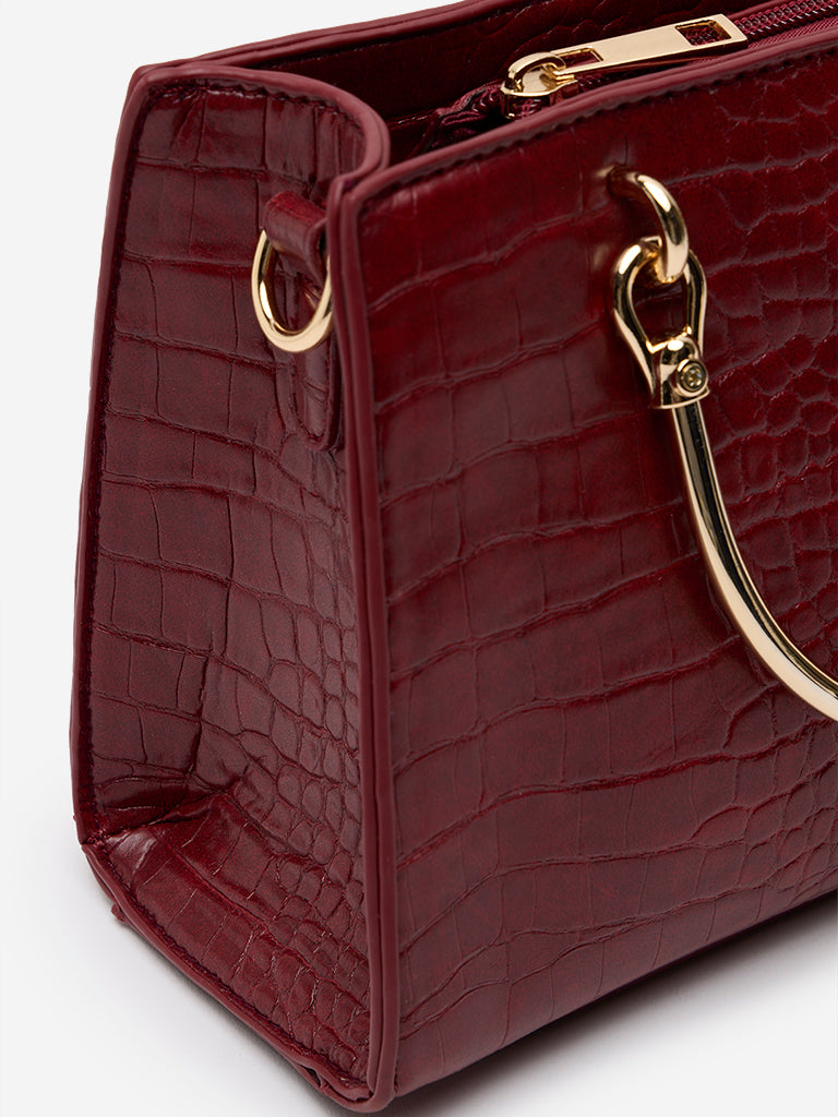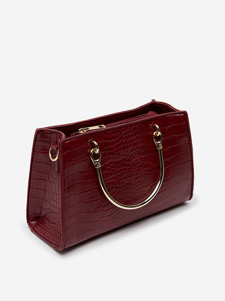 This hand bag by Westside is launched in rich maroon hue and textured finish that instantly gains the spotlight. With ample space in its single compartment. the bag is secured through a quality zipline. The semi-circular metal handle makes it chic and effortless to hold this bag.
