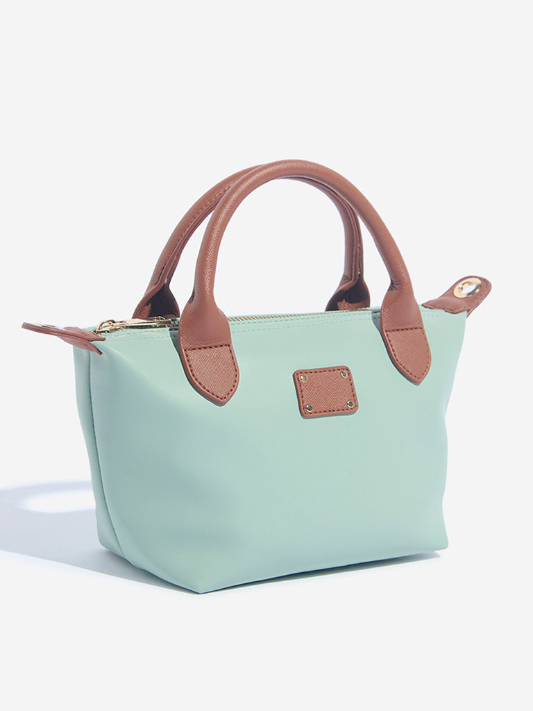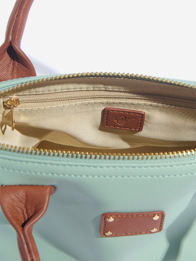 Westside presents this chic mint handbag. combining timeless style with modern functionality. It features sturdy brown double top handles and a detachable shoulder strap for a range of carrying options. The bag is fastened with a smooth zippered closure for easy access. Inside. the lined interior includes a zippered pocket to keep your essentials neatly organized.