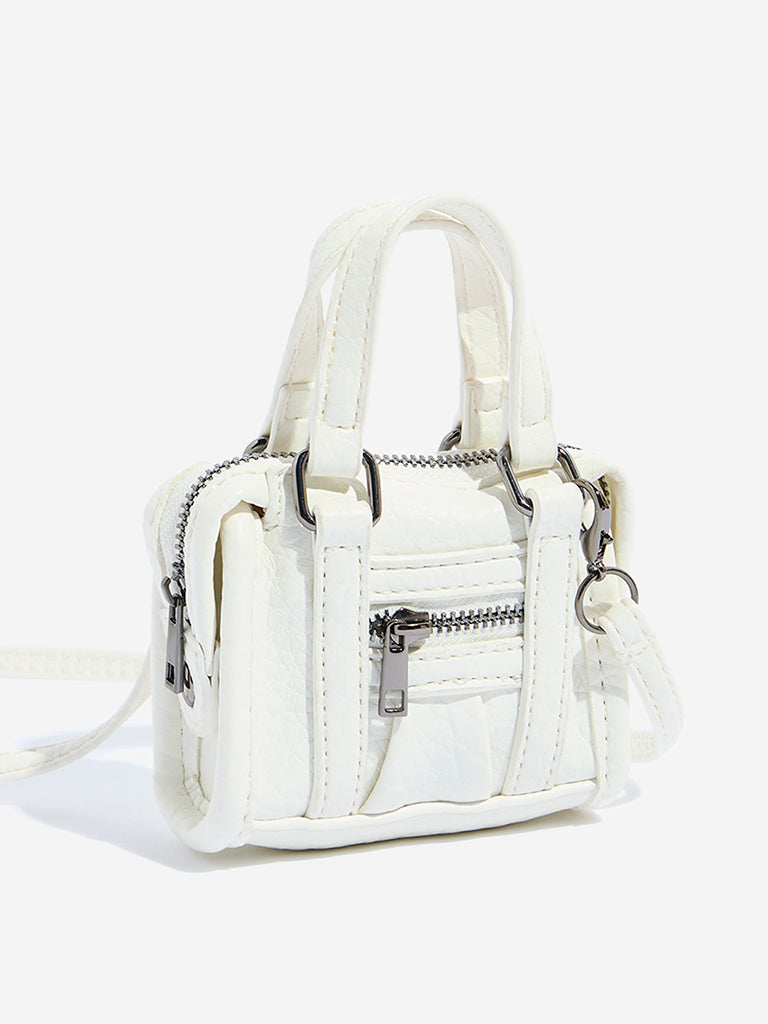 Chic and functional. this off-white mini sling bag from Westside is crafted with a textured finish for subtle elegance. The zippered sections offer compact storage. while the detachable strap adds versatility??perfect for dressing up or down