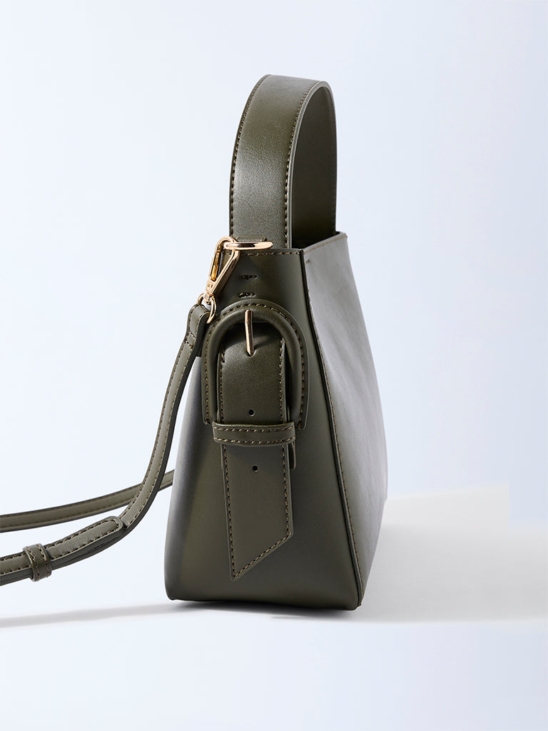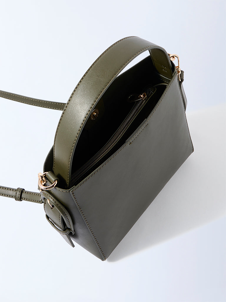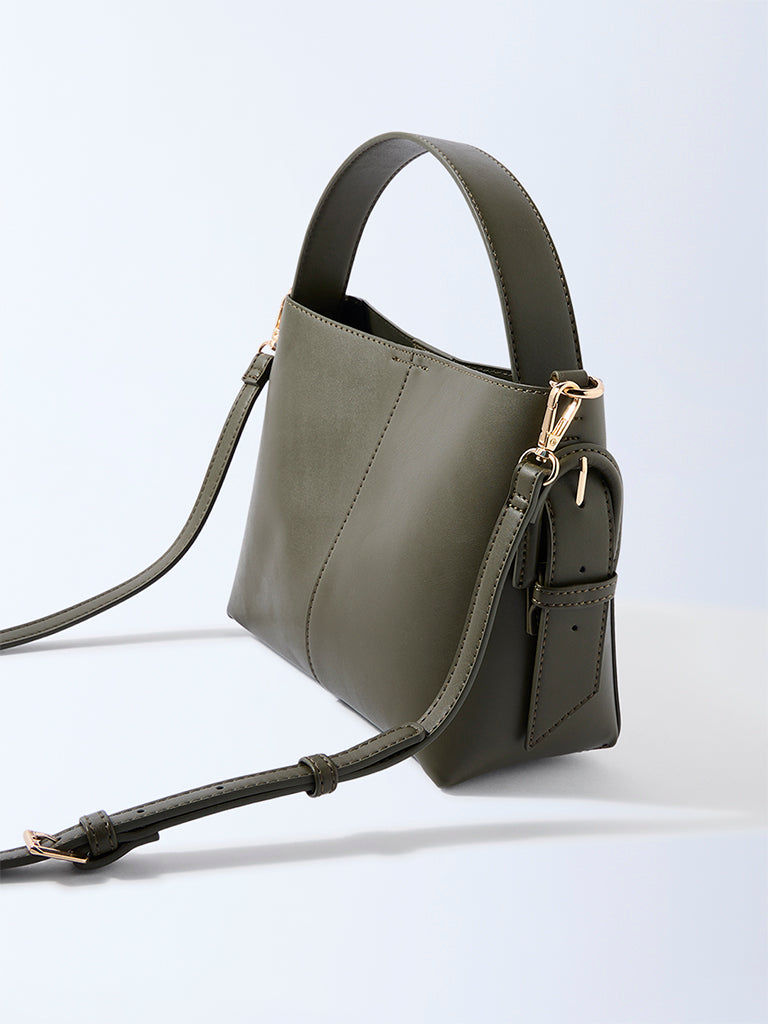 This olive bucket bag from Westside blends minimal design with smart functionality. Crafted with a structured silhouette it features a sturdy top handle and an adjustable long strap detailed with a sleek buckle accent. The spacious compartment comes with a detachable zip pouch for added convenience making it a chic choice for both casual and elevated looks.