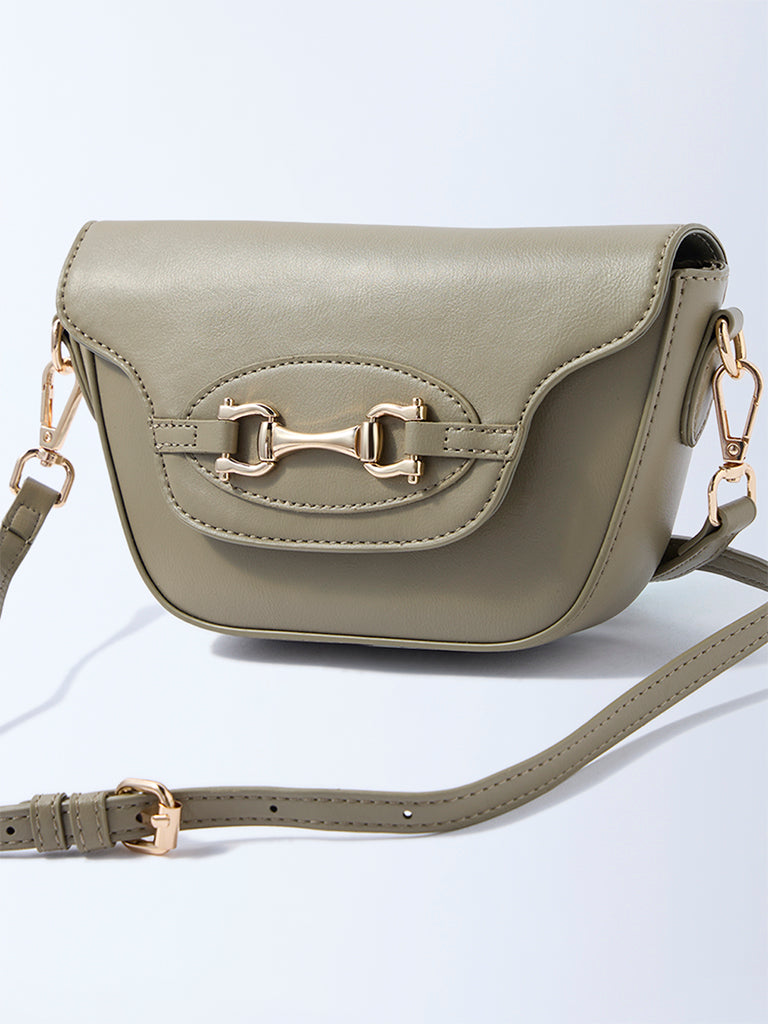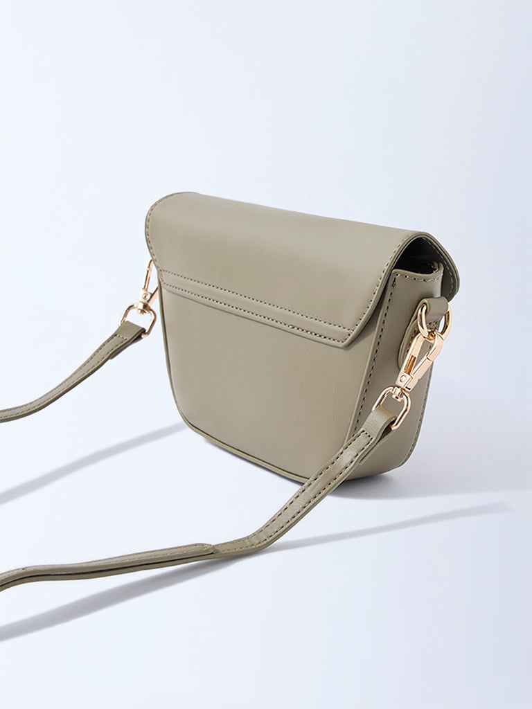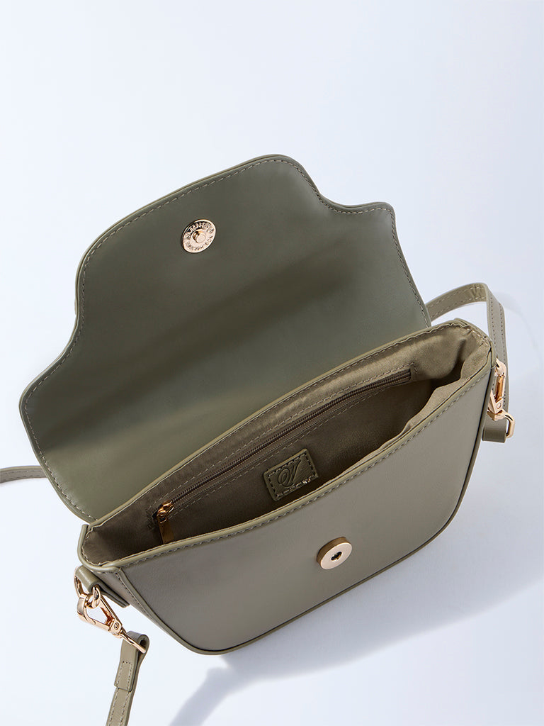 Modern and versatile. this olive sling bag from Westside brings a fresh twist to everyday styling. Crafted from smooth faux leather. it features a flap closure accented with gold-toned hardware for a polished touch. The adjustable strap ensures comfortable wear from day to night.
