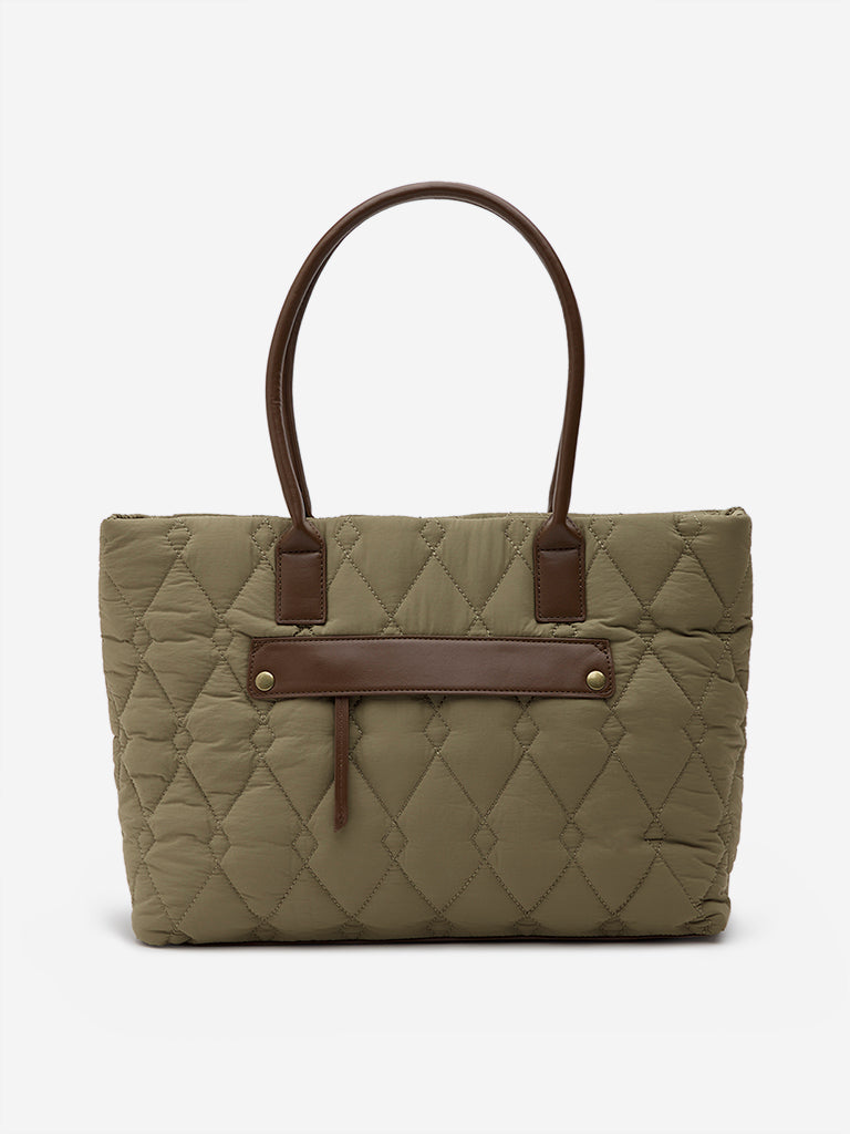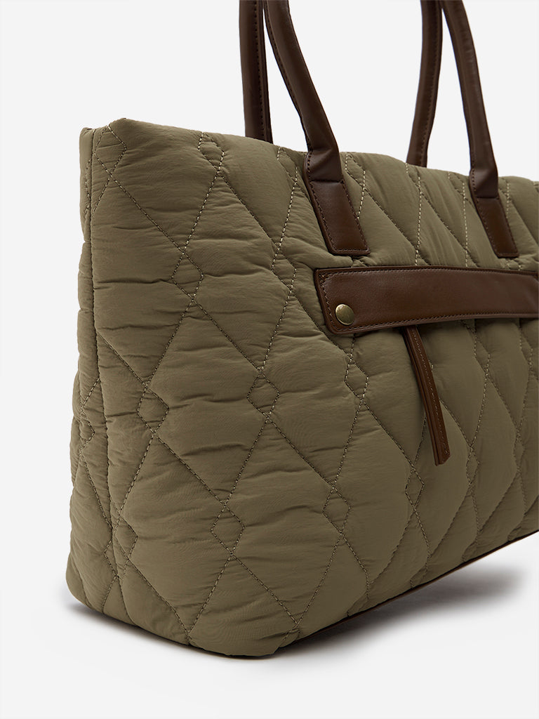This olive hand bag from Westside features a sophisticated quilted texture. It offers a spacious interior with zip lined compartments both inside and out for organized storage. The sturdy handle ensures comfortable and secure carrying. making it the perfect blend of style and functionality.