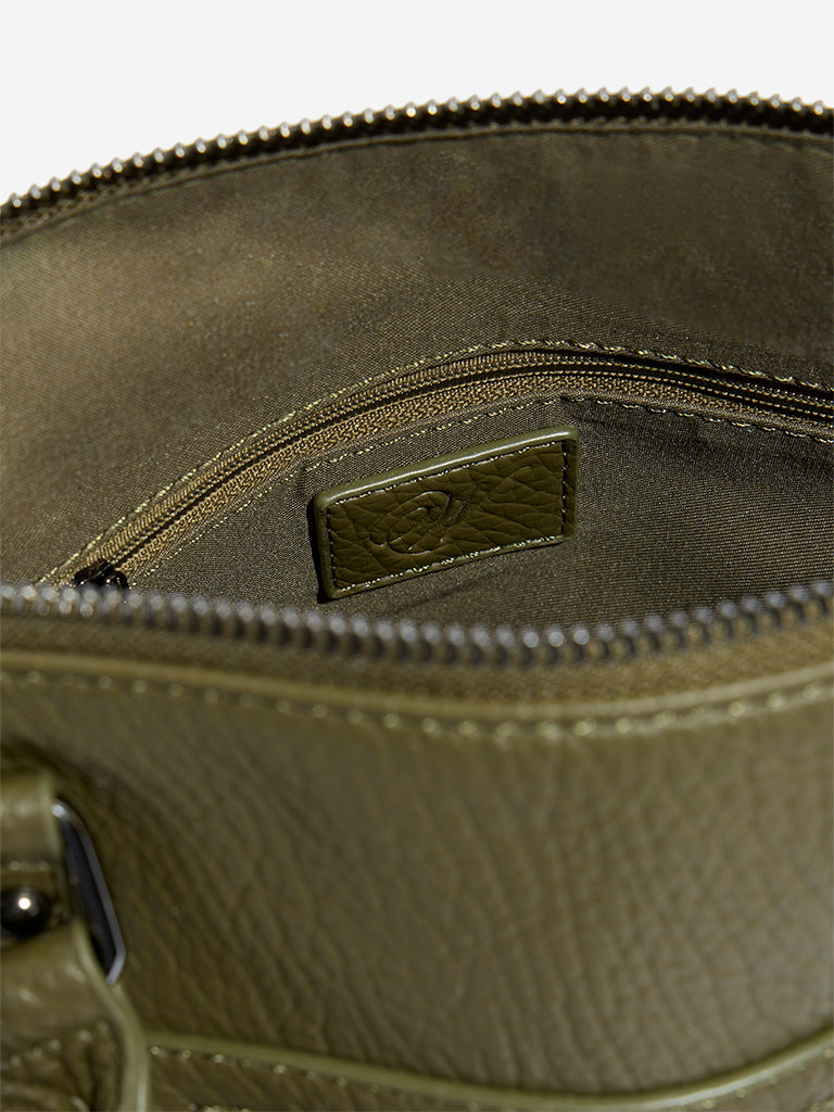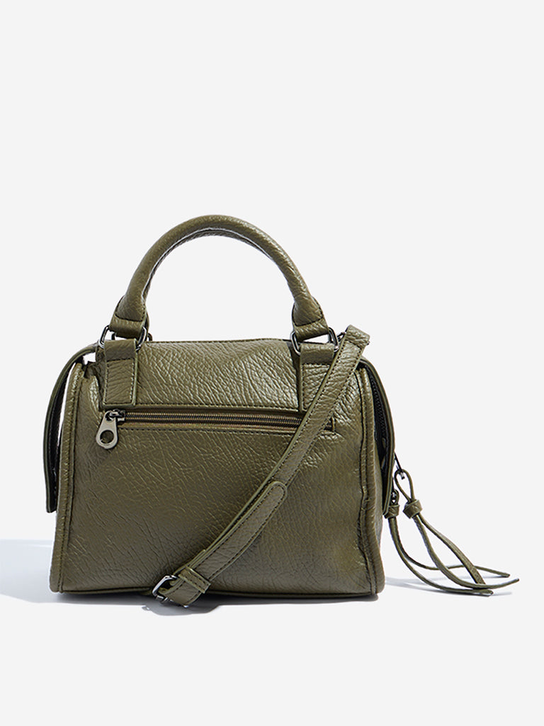 Elevate our ensemble with this olive sling bag from Westside. designed with a textured finish that combines sophistication and modern flair. Its structured silhouette houses a roomy main compartment. while external zippered sections add a functional appeal. Each zipper is elevated with matching faux-leather tassel pulls. Carry it crossbody for effortless hands-free ease or use the structured top handles for a more refined look.