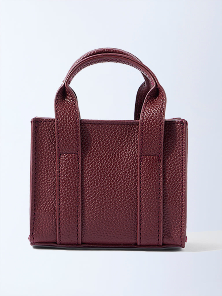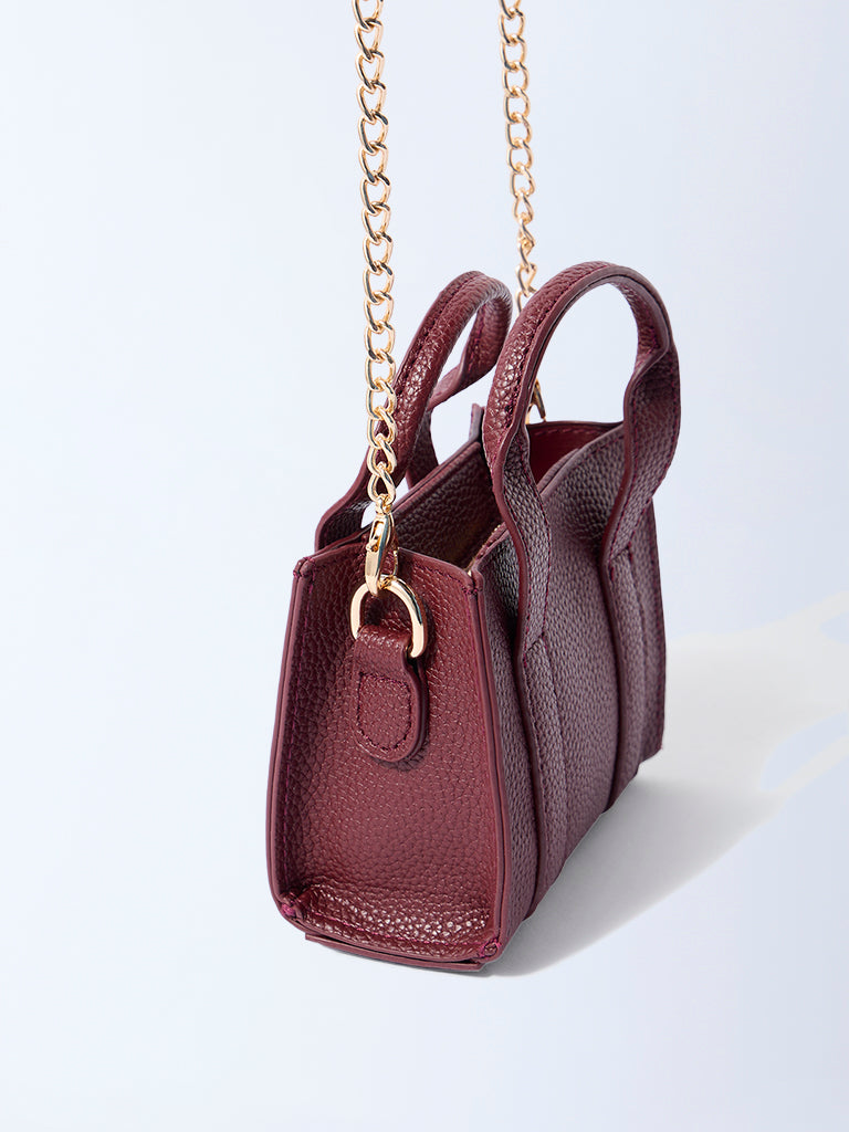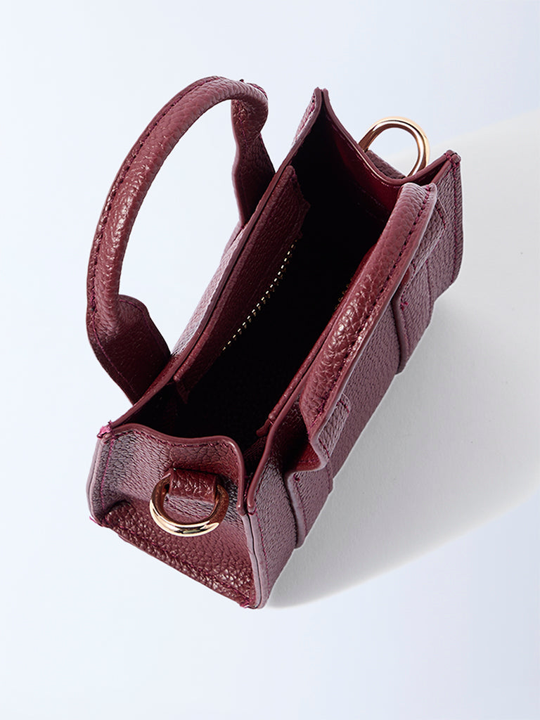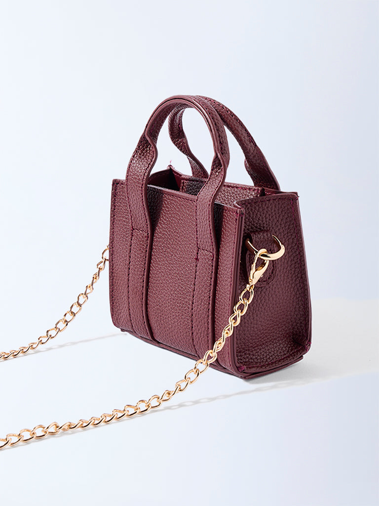 Featuring a bold hue with quiet refinement Westside brings this plum sling bag which stands out with its grain textured surface and sculpted mini silhouette. Designed with twin top handles and defined seam detailing it holds structure while keeping proportions sleek. The detachable gold chain strap adds versatility transforming it from a handheld accent to a crossbody companion. Compact yet striking it’s the perfect piece to lift neutral looks with rich confident colour.