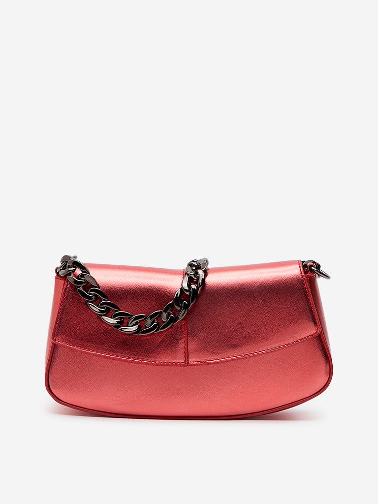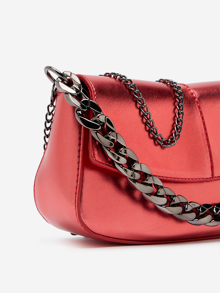 Turn heads with Westside red sling bag. featuring a striking metallic look and flap closure. The broad chain design adds a chic touch. complemented by another chain shoulder sling for versatility. With a spacious interior and durable exterior. this bag is as practical as it is fashionable.