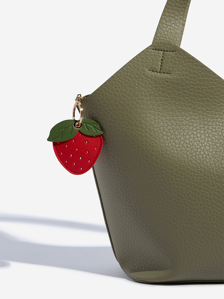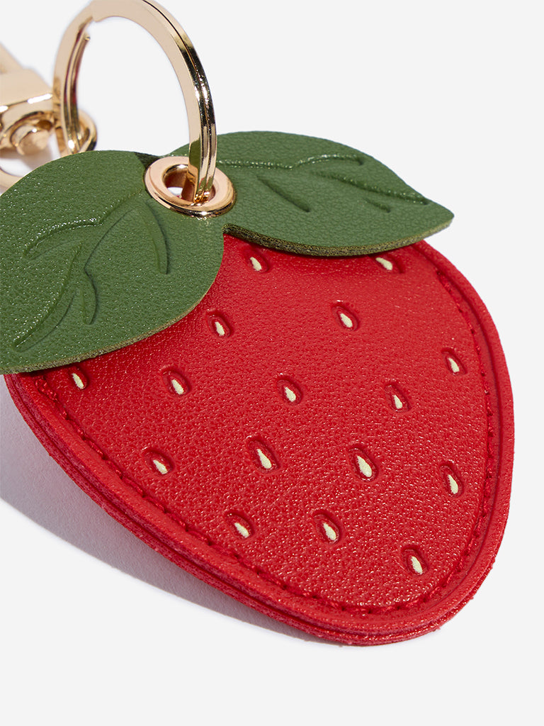 Westside introduces this red strawberry bag charm. designed to add a touch of playfulness and texture to your everyday carry. The vibrant design is detailed with tiny seed-like accents and topped with a green textured leaf element. Secured with a polished gold-toned ring and lobster clasp. it offers an easy. charming way to elevate your handbag or tote.