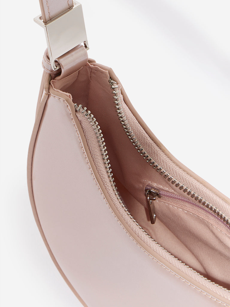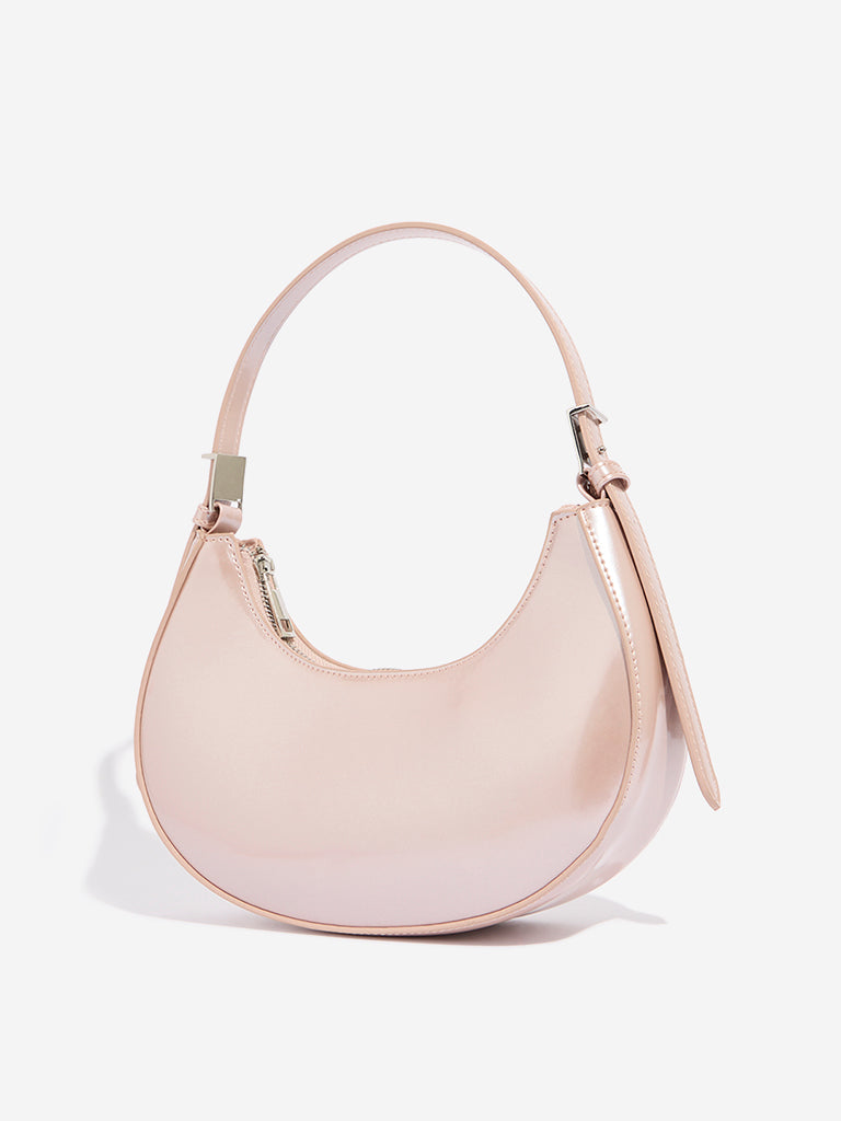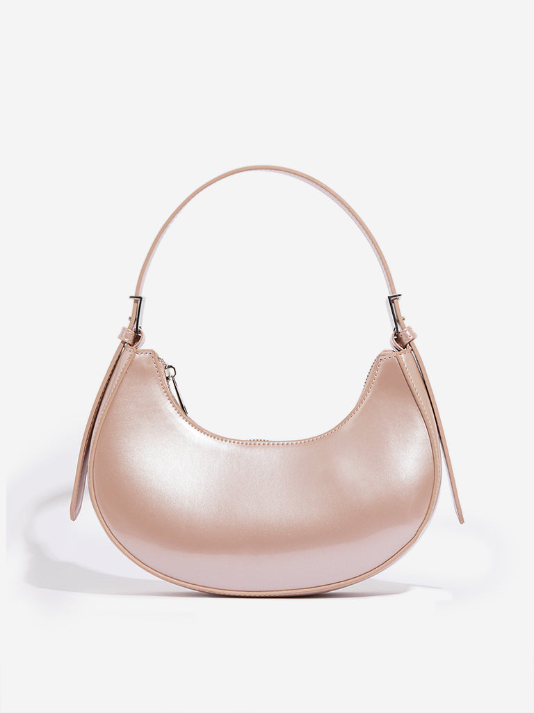 This rose gold baguette bag by Westside Accessories flaunts a glossy hue and comes with an adjustable strap. Enclosed with a metallic zipper. this modish bag has a sleek design that allows you to carry your daily essentials. A zipped compartment adds practicality to its stylish affair.