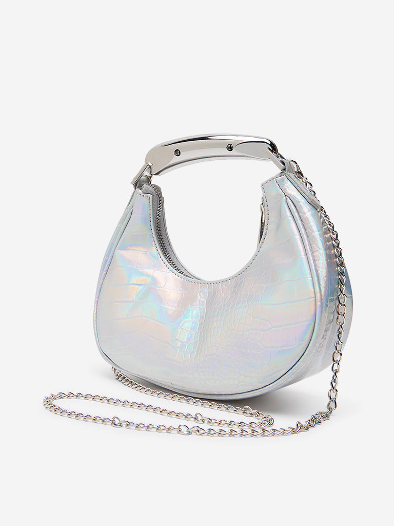 Elevate your accessory collection with Westside’s silver faux-leather hand bag. The U-shape structure and chic textured design add sophistication to its compact form. Featuring a single chain compartment and a chunky metal accent handle. it exudes both style and functionality.