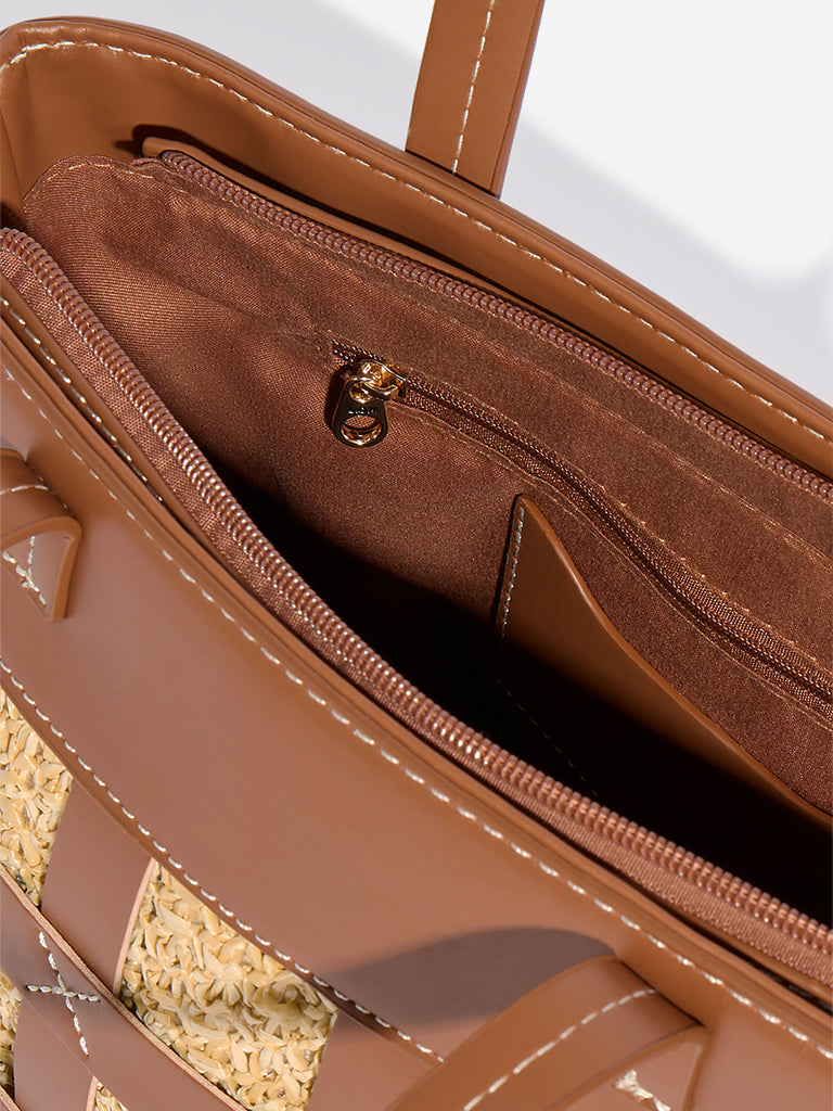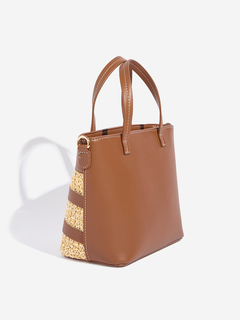 Westside Accessories adds this tan bucket bag to its portfolio exhibiting checkered design with raffia-like designs. It features an adjustable shoulder strap. a gold-accent zipper enclosing ample space for your daily essentials and a hidden compartment.