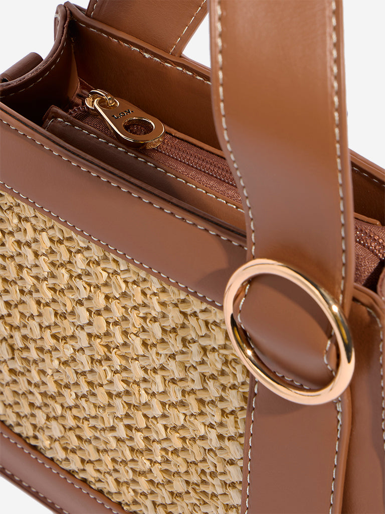 This tan handbag by Westside Accessories features a raffia-textured design and has an embellished ring detail. With an adjustable shoulder strap and an enclosed space featuring a hidden compartment encloses space for your essentials.