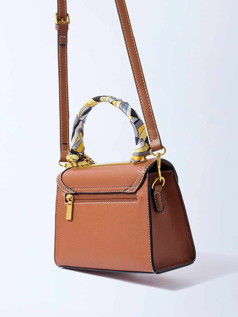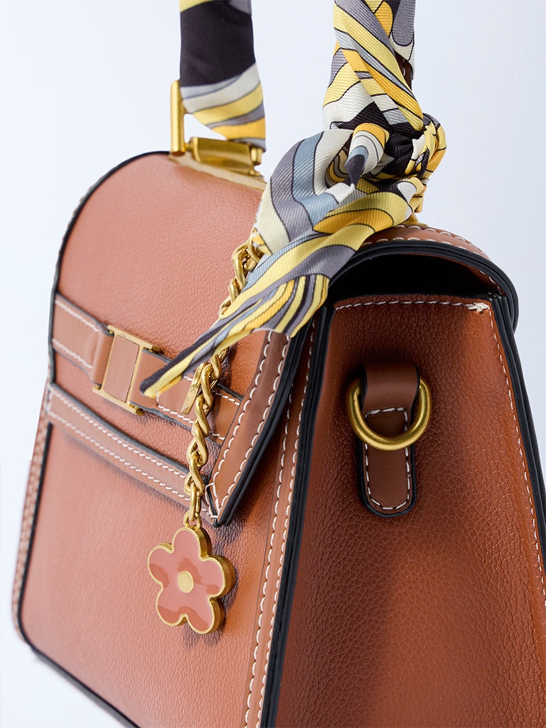 The ultimate wear-with-anything accessory. this tan satchel from Westside brings effortless elegance to every outfit. Its warm. versatile tone pairs seamlessly with both neutrals and brights. while the green-and-white checkered scarf detail adds a touch of playful charm. Finished with a gold charm for subtle glamour. it’s a statement piece that transitions with ease from coffee runs to evening plans.