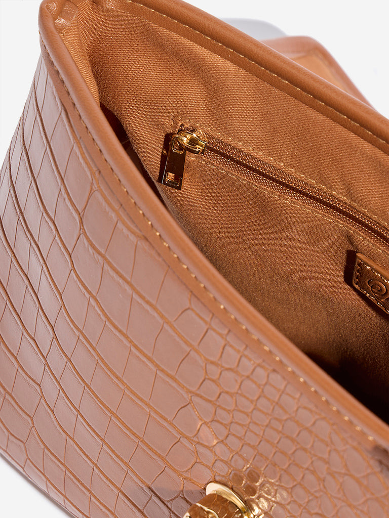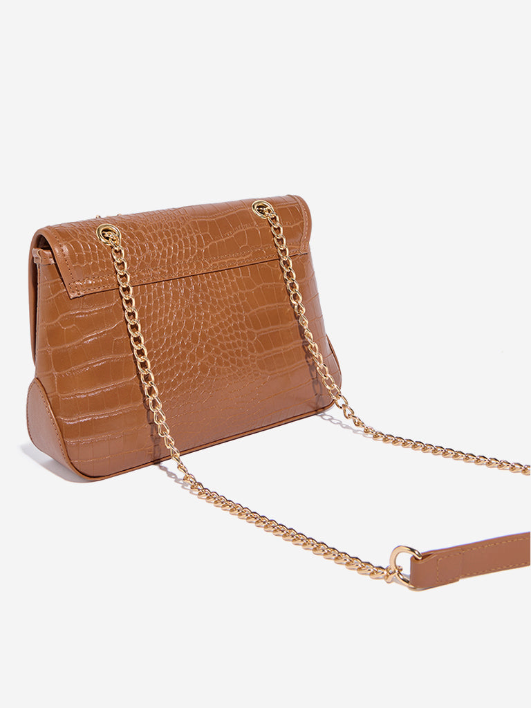 Westside Accessories exhibits this tan sling bag featuring a textured profile with gold-accent metallic embellishments. A metallic chained shoulder sling adds a modish finish to its glossy lustre. It encloses ample space with a hidden compartment and has a twist-style metallic clasp.
