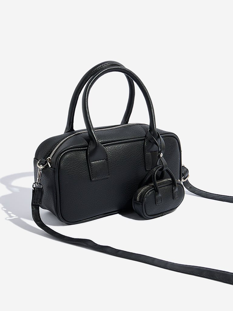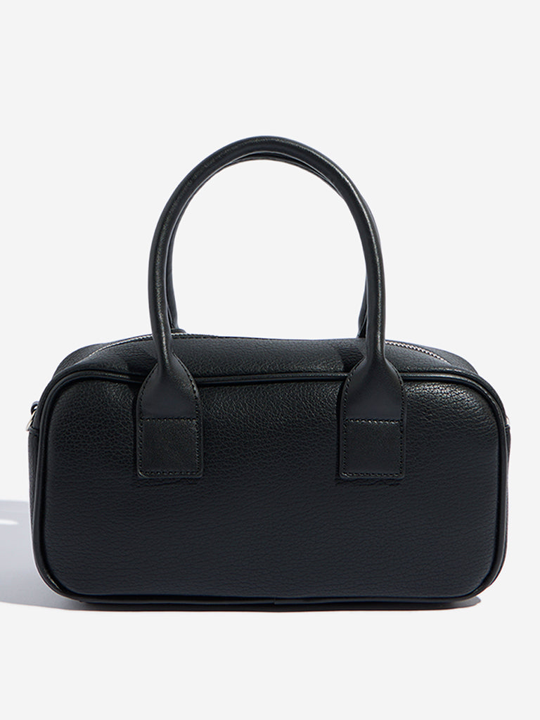 This black crossbody bag by Westside stands out with its structured rectangular profile and grain-textured finish. The design is anchored by two firm top handles and a detachable. adjustable sling strap. offering a balanced blend of form and function. Whether styled as a handheld piece or worn crossbody. it lends a sharp. contemporary accent to weekday edits and off-duty ensembles alike.