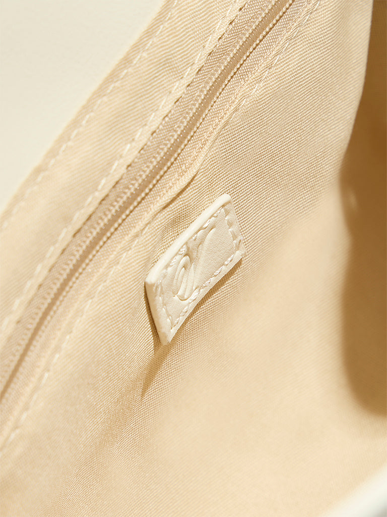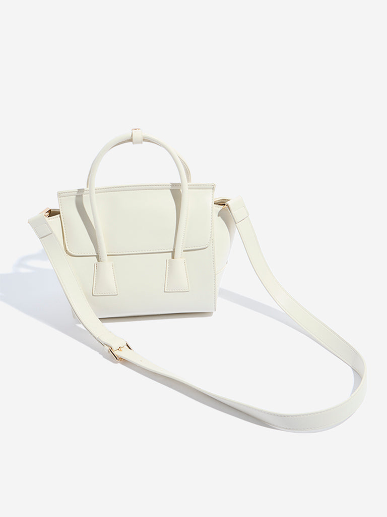 This white sling bag from Westside features a structured frame with a flared base that adds subtle depth to its design. The smooth. polished exterior is paired with two slender top handles for elegant handheld carrying. while a detachable. adjustable strap allows for versatile shoulder or crossbody wear. A spacious interior offers plenty of room to keep your essentials organized. Combining style and function. this bag is a refined addition to both workwear and casual outfits.