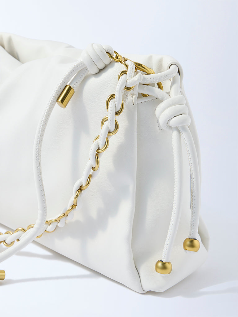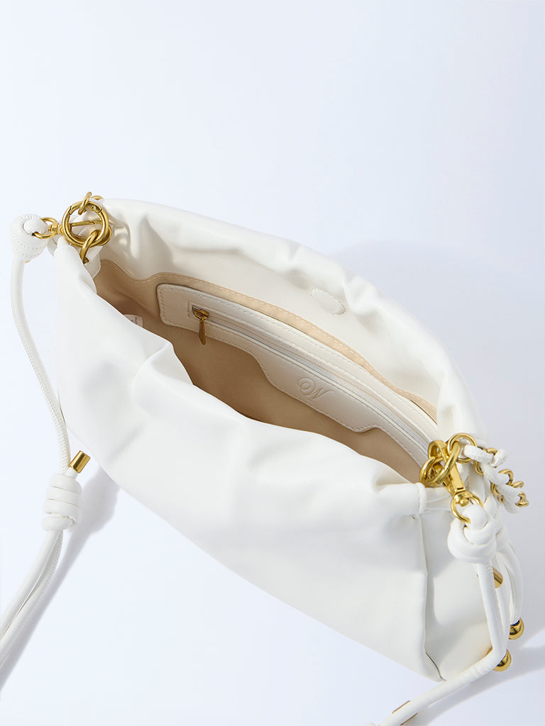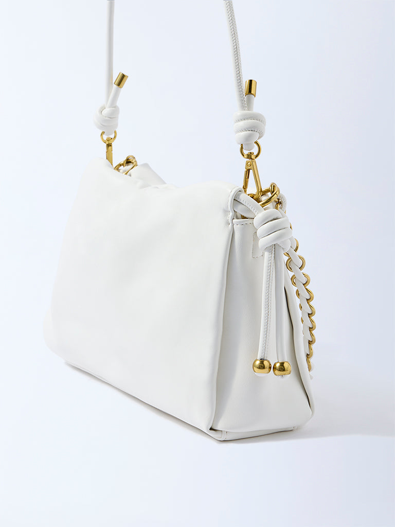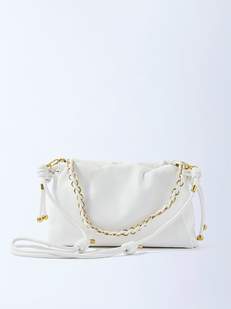 Chic and contemporary. this white sling bag from Westside makes a stylish statement for any occasion. Made from smooth faux leather. it features a gathered silhouette enhanced with a gold-toned chain strap and knotted drawstring sides. The detachable sling handle adds versatility. perfect for both daytime polish and evening elegance.