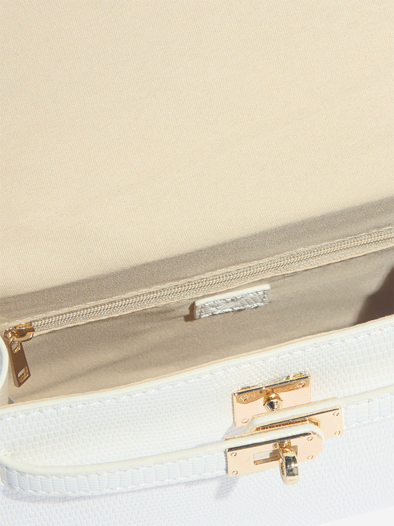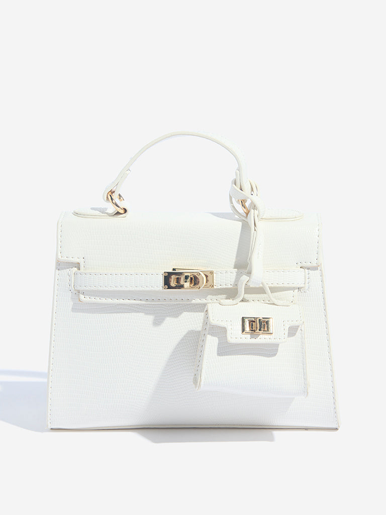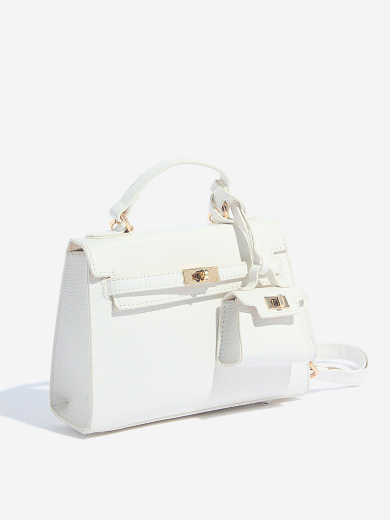 This white sling bag from Westside presents a clean. structured silhouette. It features a single sturdy top handle and a detachable. adjustable shoulder strap for versatile carrying options. The bag is secured with a stylish top flap and a gold-toned twist-lock closure. A small front pocket offers added storage. while the spacious main compartment includes an interior zippered pocket to keep your essentials organized.