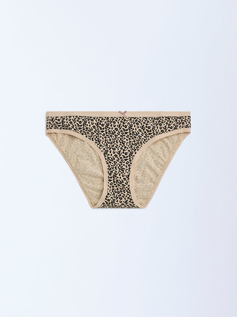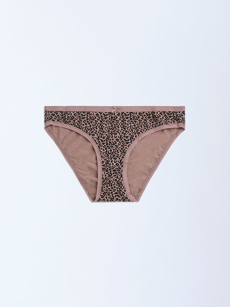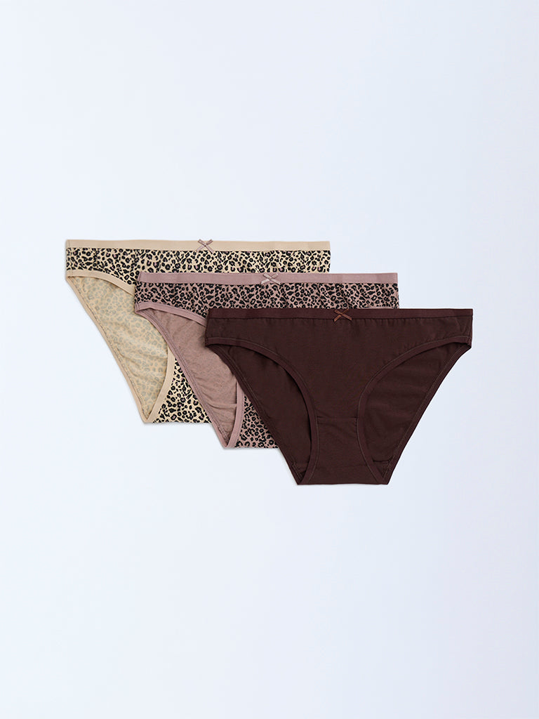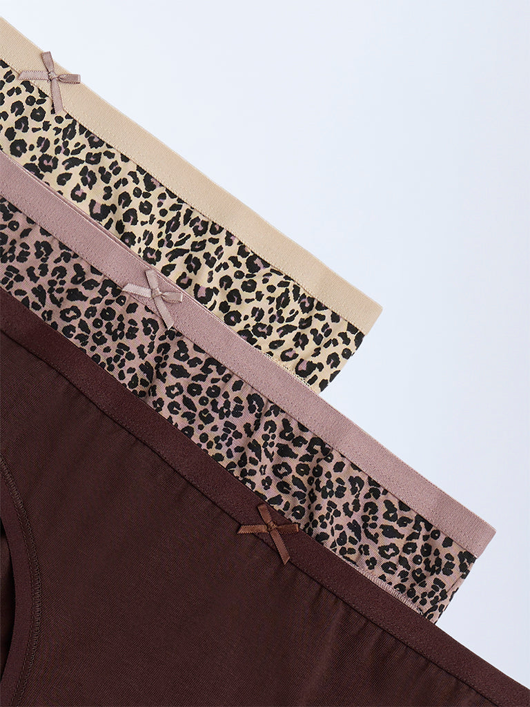 This pack of three bikini briefs from Wunderlove brings together soft comfort and unapologetic edge. Created from a cosy cotton blend fabric. the set features mauve and beige leopard prints alongside a solid dark brown for balance. With moderate coverage and soft elastic waistbands. each piece is made to move with you.