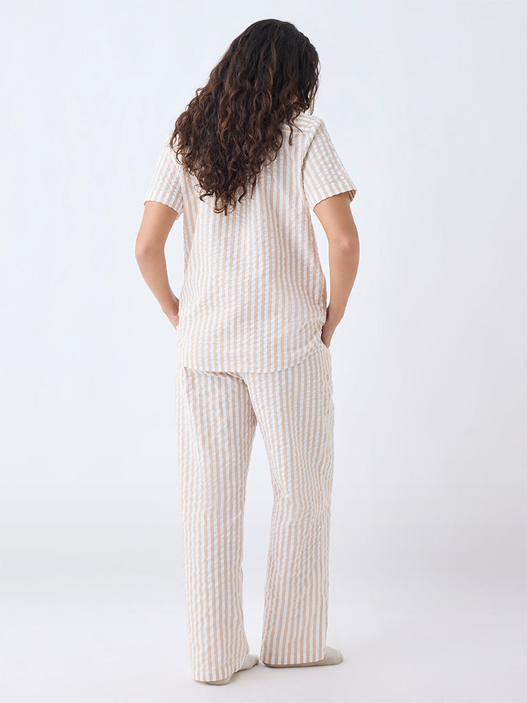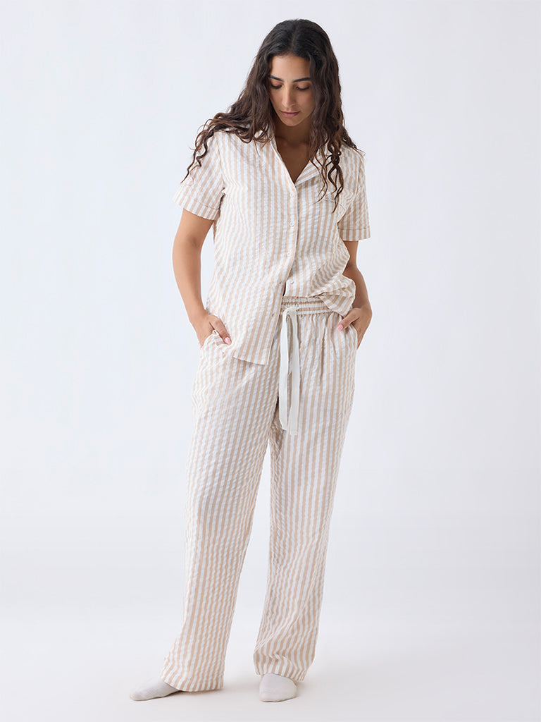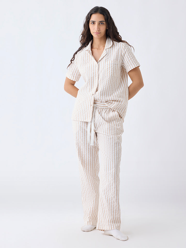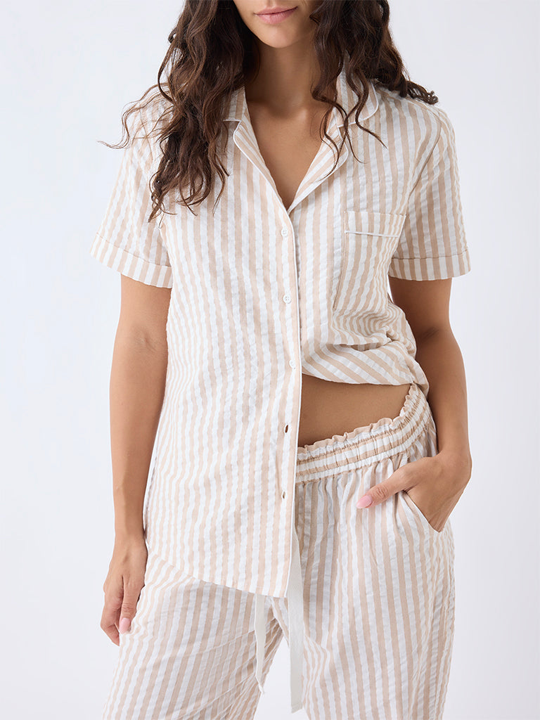 Rediscover the art of unwinding with this beige pyjama set from Wunderlove. Milled from pure cotton for a breathable feel. it’s designed with timeless stripes that exude laid-back sophistication. The shirt comes styled with a notched lapel collar and short sleeves. while the pyjamas feature an elasticated drawstring waistband and side pockets.