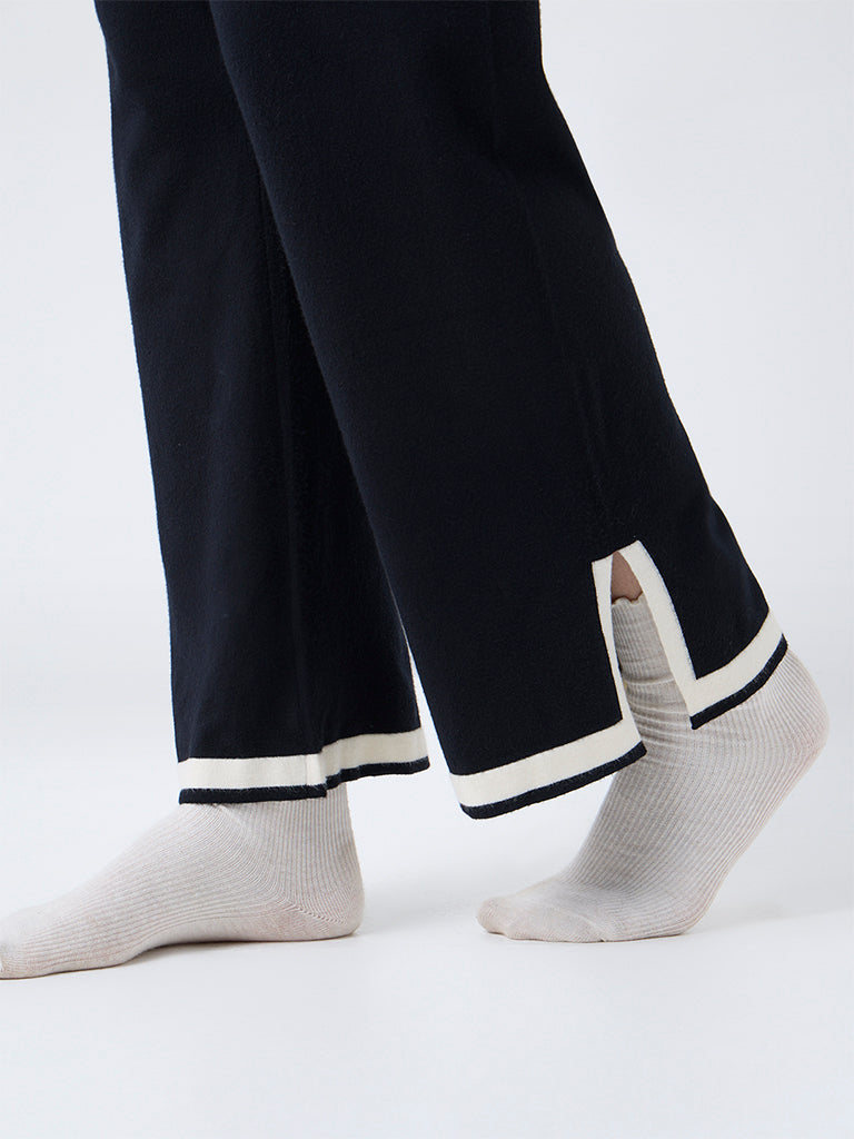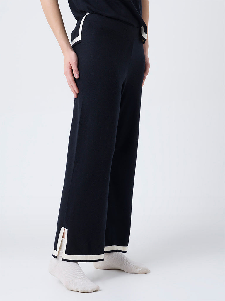 These black pants by Wunderlove are crafted from soft. premium-blend fabric for superior comfort. Structured in a high-rise. they are fitted with an elastic waistband for a flexible fit. Detailed with contrast stripes along the hem for a distinct detail. this is a refined essential for cozy home stays.