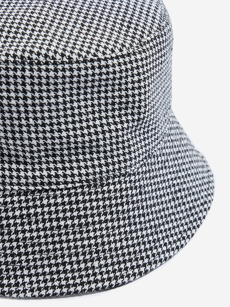 Wunderlove puts a chic twist on sun-ready style with this black bucket hat. defined by its classic houndstooth pattern. Crafted from a lightweight fabric. it promises breathable comfort while lending a touch of personality to warm-weather looks. The soft brim offers light sun protection. and the flexible silhouette makes it easy to fold and pack on the go.