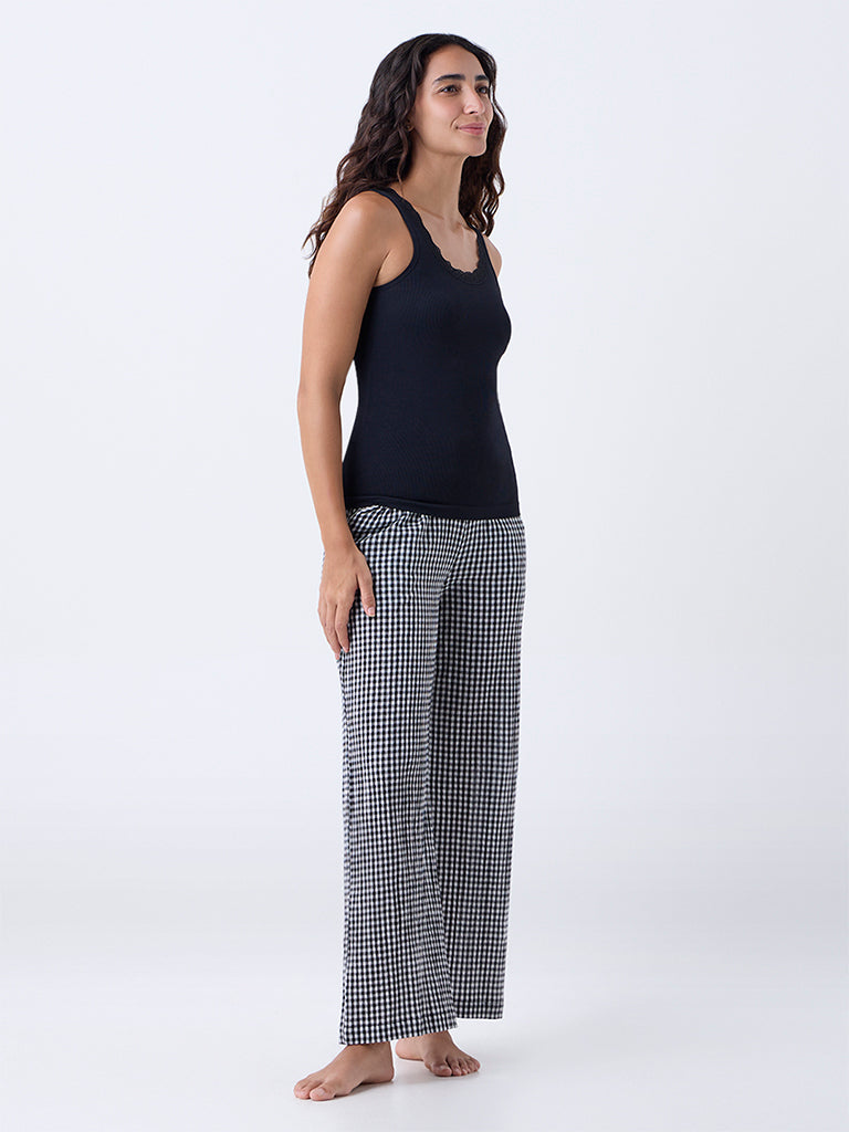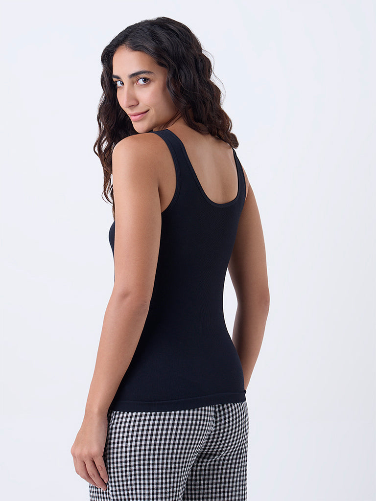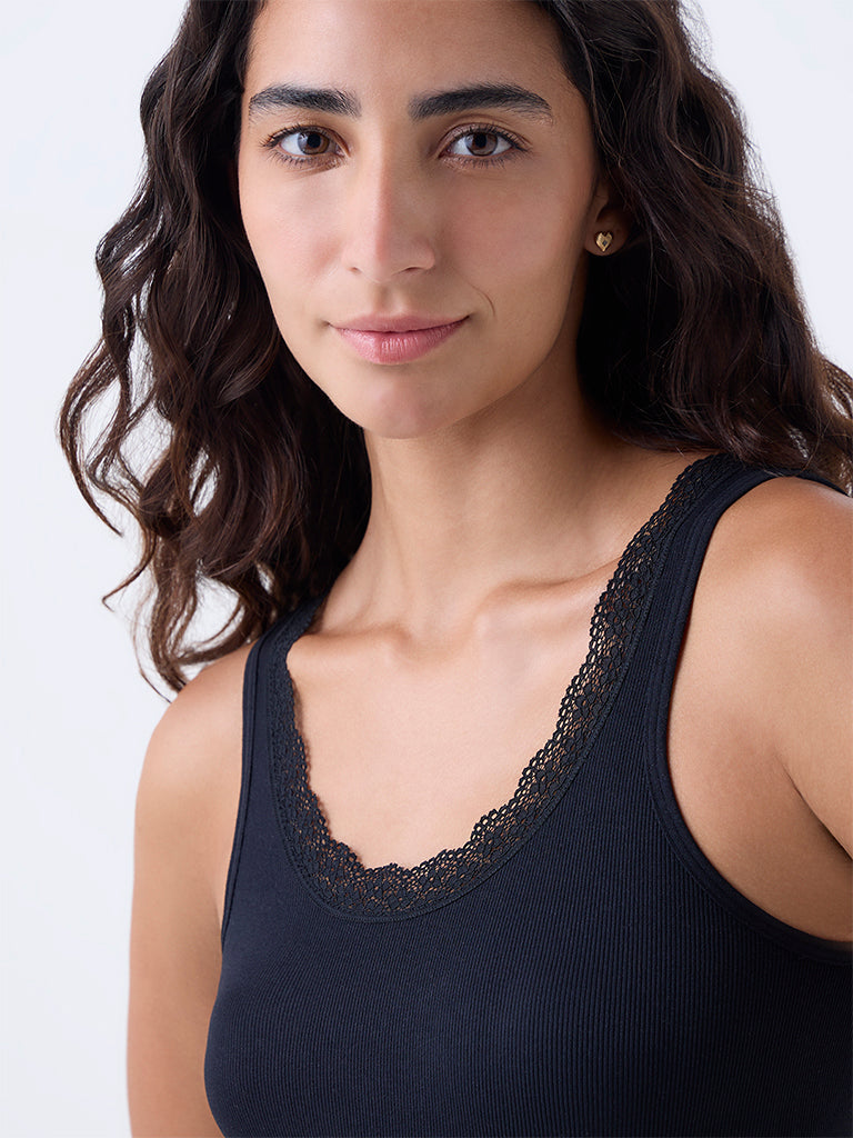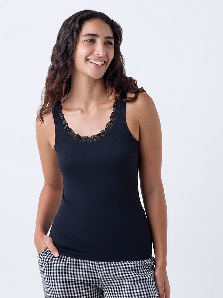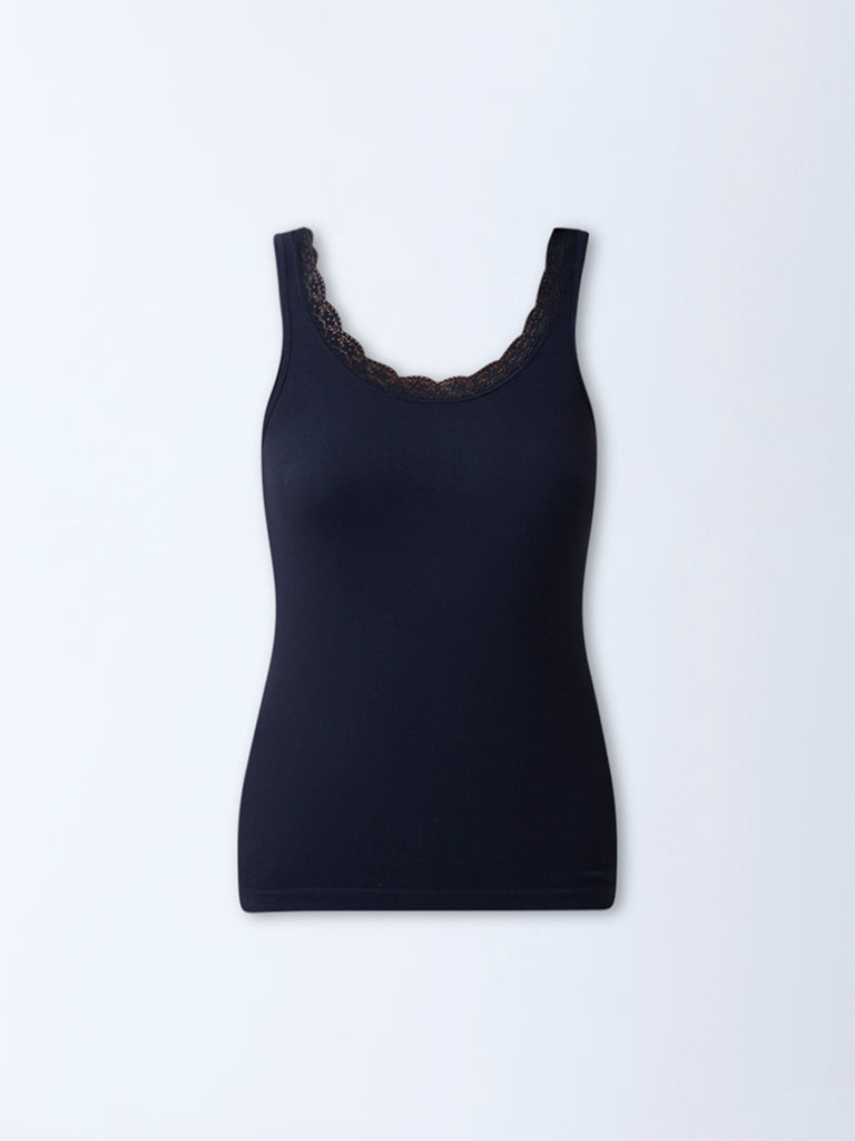 This black camisole from Wunderlove is styled with a round neck and sleeveless silhouette for versatile wear. The neckline is trimmed with lace. while the soft fabric ensures comfort throughout the day. A refined essential. it layers effortlessly under shirts or works as a standalone piece for casual looks.