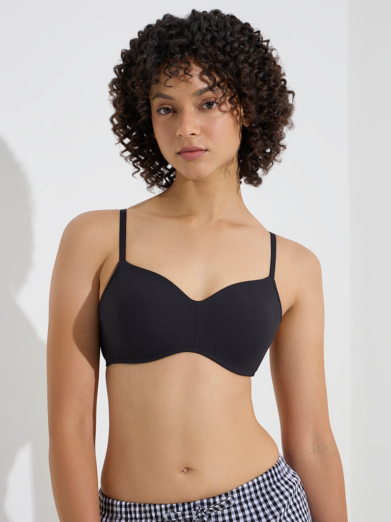 This black bra from Wunderlove is fashioned from a ribbed-textured fabric that ensures all-day comfort and a seamless look under clothing. Designed with a lightly padded structure for subtle shaping. it features adjustable straps and a hook-and-eye closure at the back for a personalised fit.