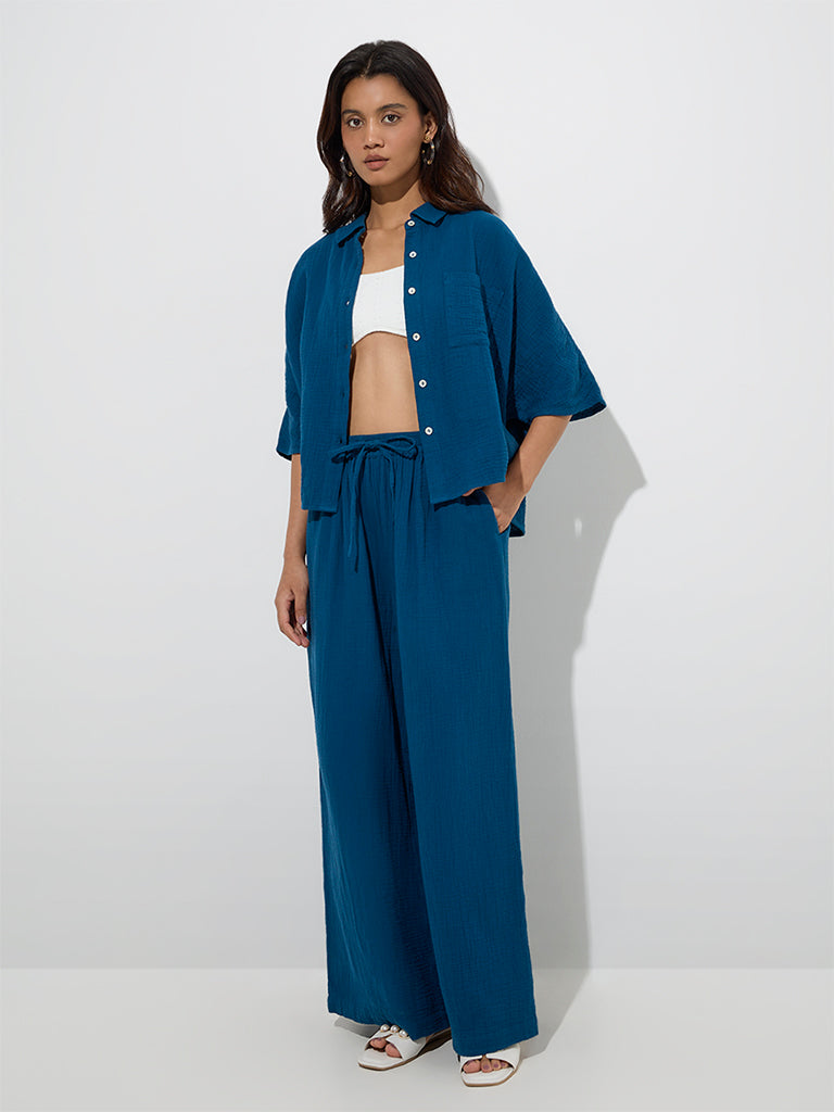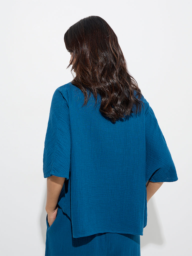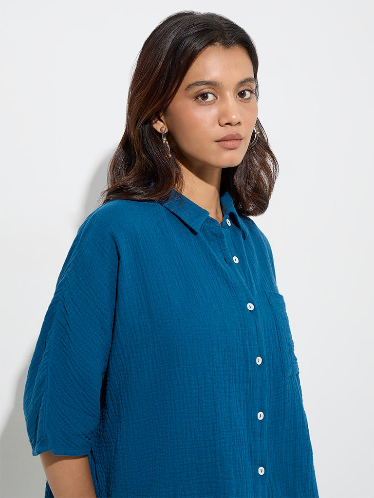 Wunderlove Blue Crinkle-Textured Cotton Beach Shirt