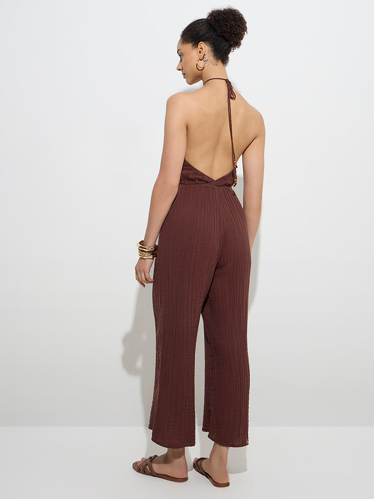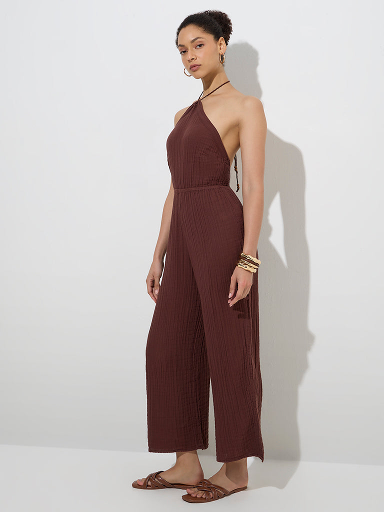 Wunderlove Brown Crinkle-Textured Cotton Beach Jumpsuit
