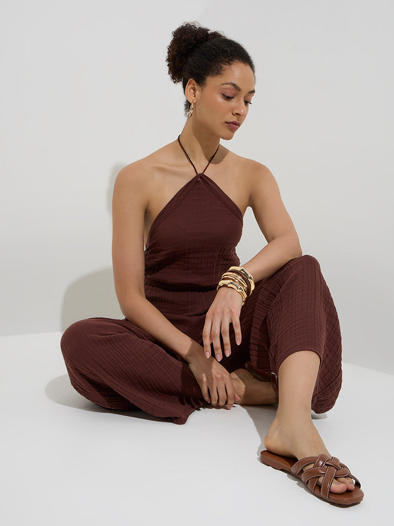 This brown cotton jumpsuit from Wunderlove Swimwear is milled from a crinkle-textured fabric for a breezy feel. Featuring a halter neck with a stylish tie-up at the back. its elegant backless design adds a sophisticated touch. The elasticated waistband provides a secure and comfortable fit.