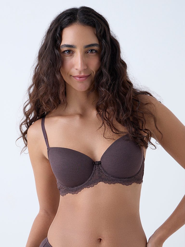 Designed to keep up with your day without compromising on style. this dark brown bra from Wunderlove blends function with finesse. Crafted from premium fabric. it features ribbed detailing on the cups for subtle texture. while exquisite lace adds a feminine finish. Adjustable straps and a secure back closure ensure reliable support that moves with you.