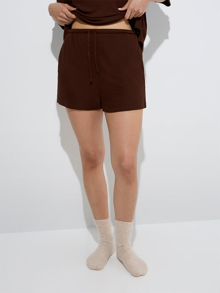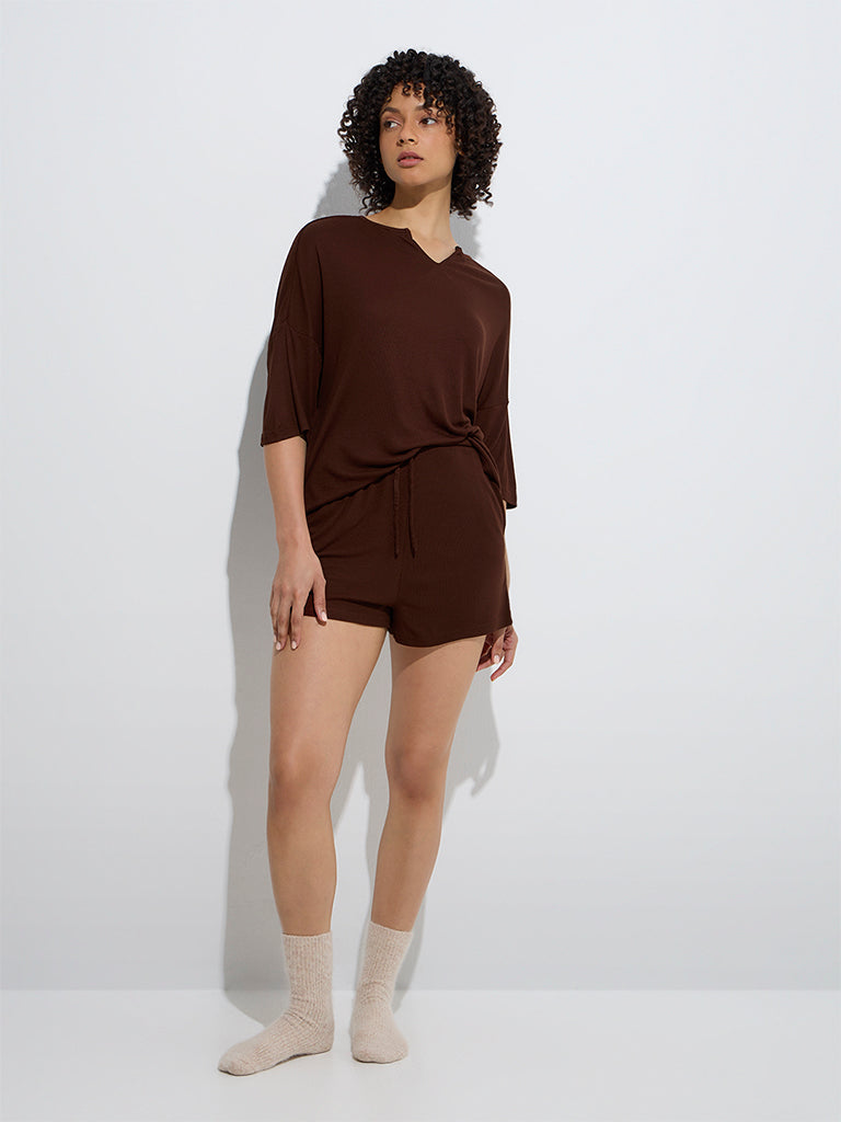 Wunderlove Dark Brown Ribbed-Textured Lounge Shorts
