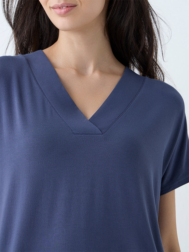Slip into slumber with the soothing comfort of this dusty blue t-shirt from Wunderlove. Designed with a V-neck and short sleeves. it is woven from a sumptuous fabric that feels light against the skin. Perfect for winding down or lounging in style. it adds ease to your nighttime and off-duty wardrobe.