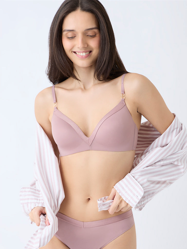 Refresh your lingerie rotation with this dusty pink bra by Wunderlove. Padded cups provide gentle support and a naturally contoured shape. while a delicate mesh overlay adds subtle texture and visual interest. With a secure hook closure and adjustable straps. it delivers a fit that’s both comfortable and personalised.