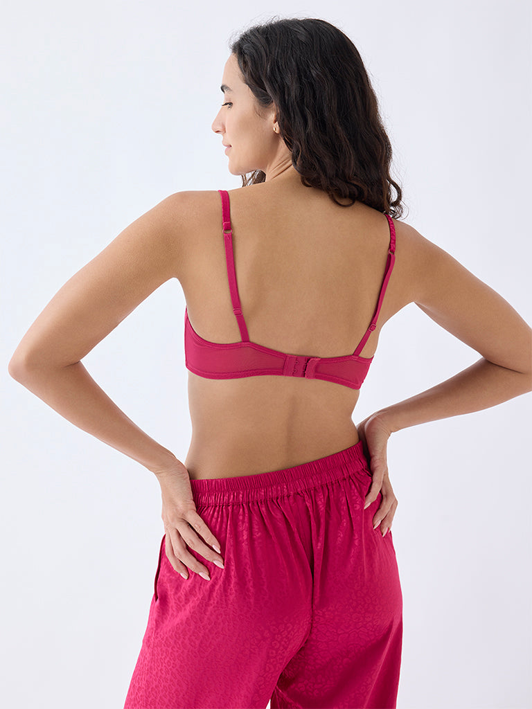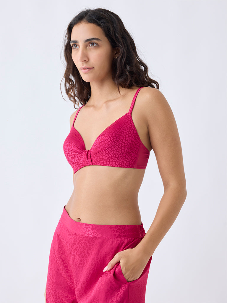 Bold yet feminine. this fuchsia bra from Wunderlove makes a striking statement with its animal jacquard texture and playful knot detail at the centre. Lightly padded cups create a smooth shape. while adjustable straps and a hook-and-eye closure promise all-day comfort.