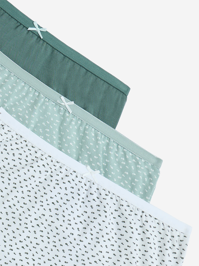 Wunderlove introduces this pack of three full-coverage briefs in soothing shades of green and white. featuring a charming mix of floral prints and a solid option. Milled from a soft cotton-blend fabric for all-day comfort. each pair is finished with a smooth elastic waistband and a delicate bow at the front for a feminine touch.