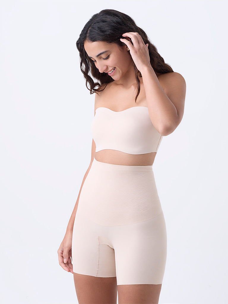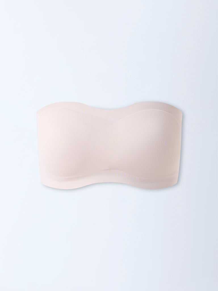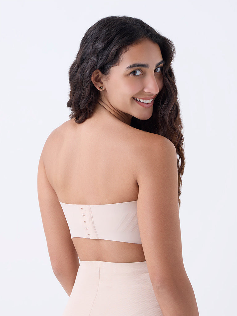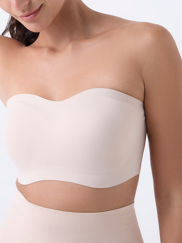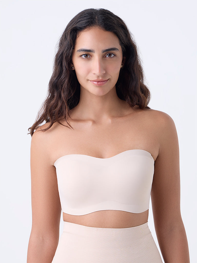 Wunderlove presents this light beige strapless bra. crafted with padded cups for a naturally contoured shape. The design is enhanced with super grip technology that keeps it securely in place. while the invisible finish ensures it remains discreet under fitted clothing. Made from high-quality fabric with a back hook closure. it balances comfort. support. and versatility for everyday wear.