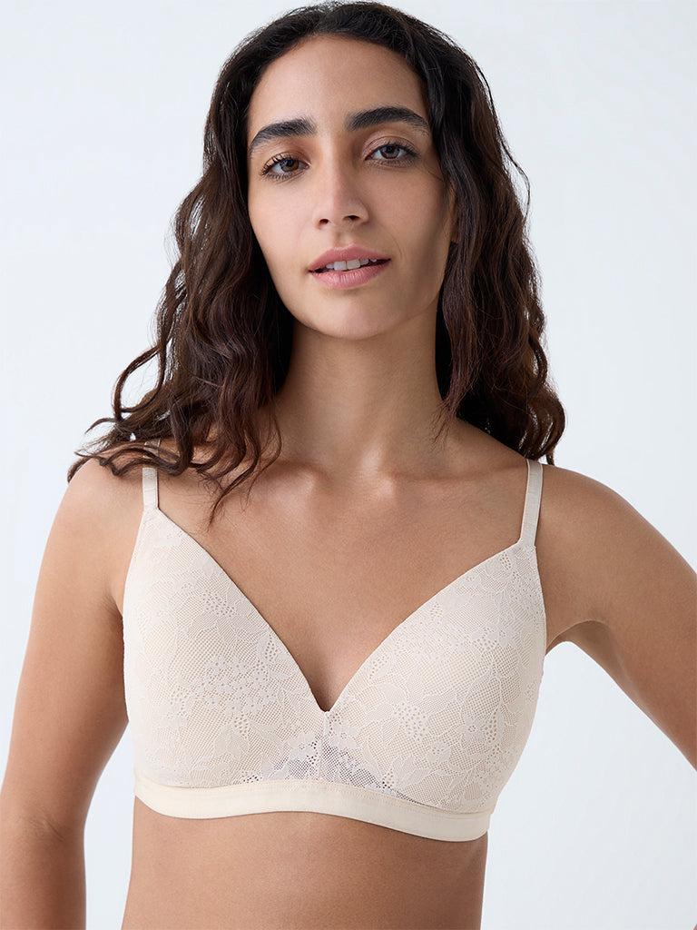 Lean into effortless elegance with this light beige bra from Wunderlove. Defined with a floral lace overlay. it features padded cups that offer gentle shaping and a smooth finish under any outfit. The breathable fabric ensures lasting comfort. while adjustable straps and a hook-back closure provide a customised fit.