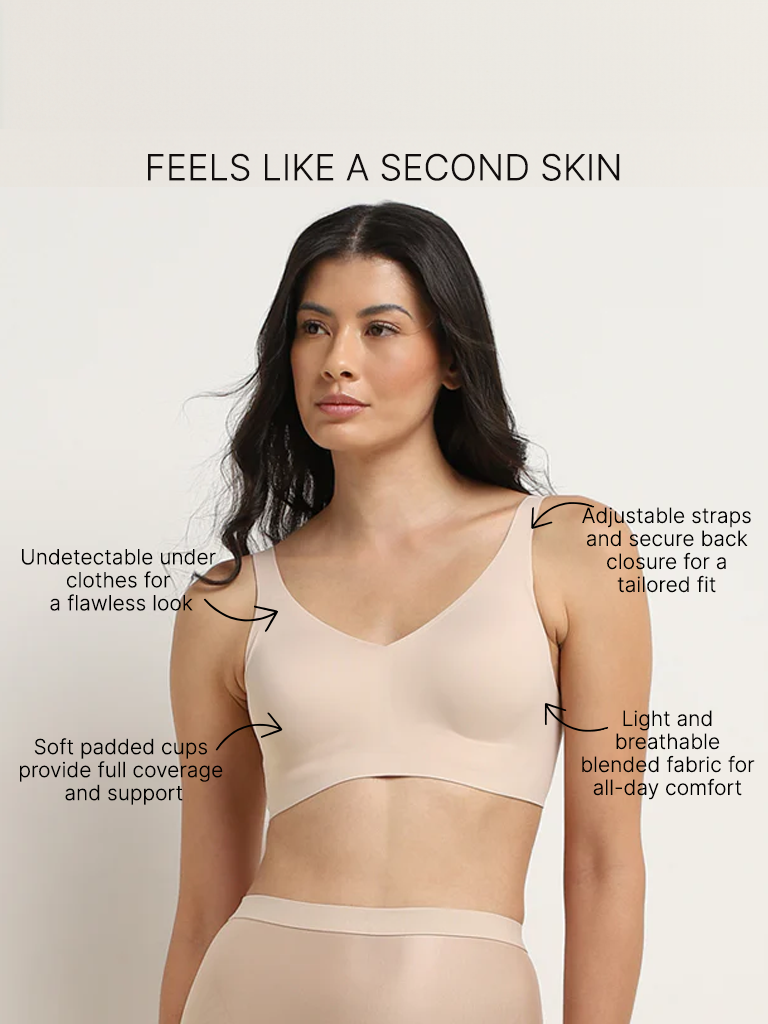 This light beige bra from Wunderlove offers a seam-free finish and is made from breathable fabric. ensuring everyday comfort. It includes soft padded cups for enhanced support and features adjustable straps along with a secure hook closure at the back for a personalized fit.