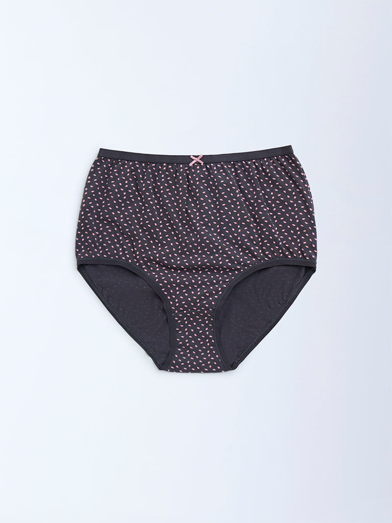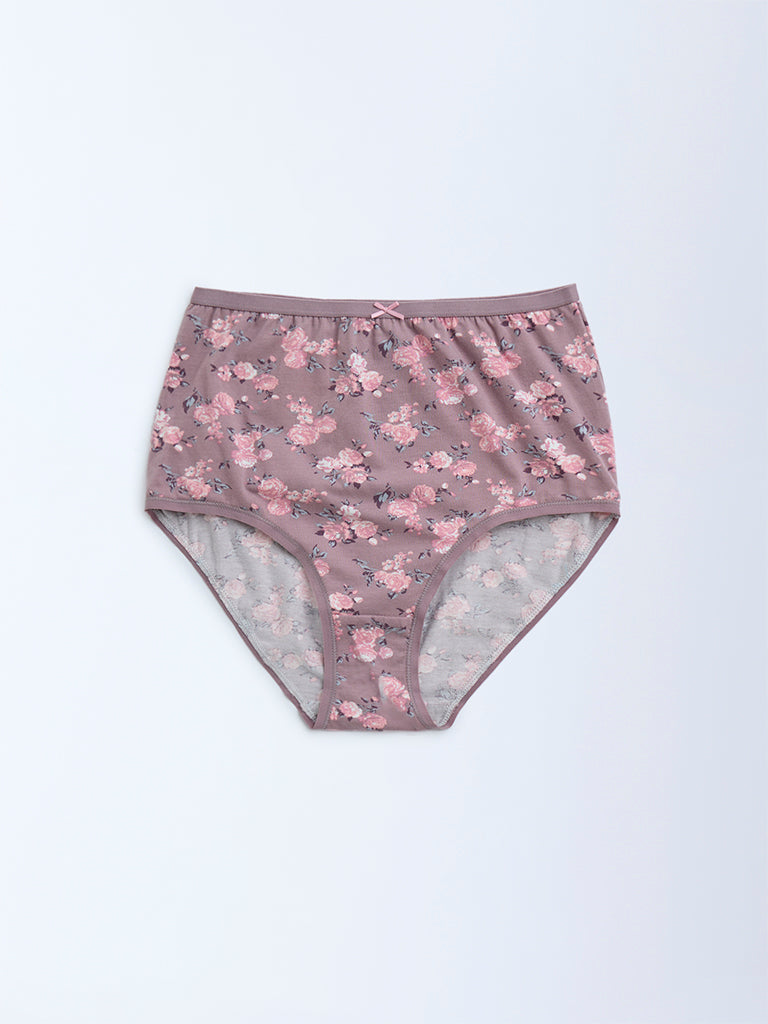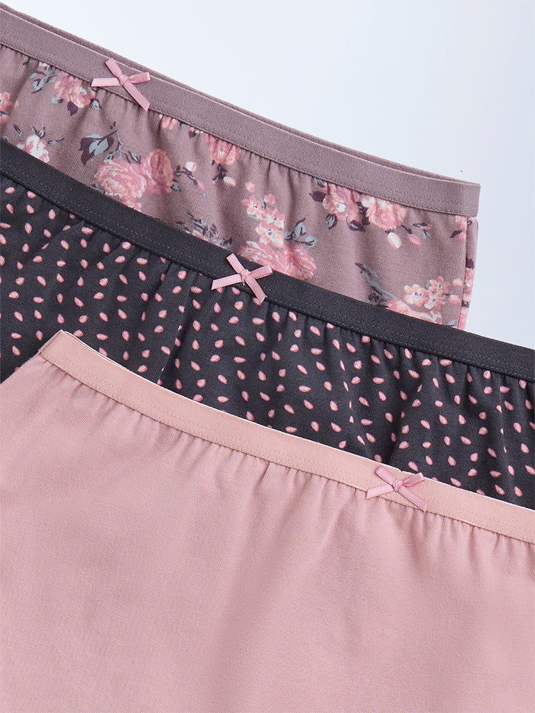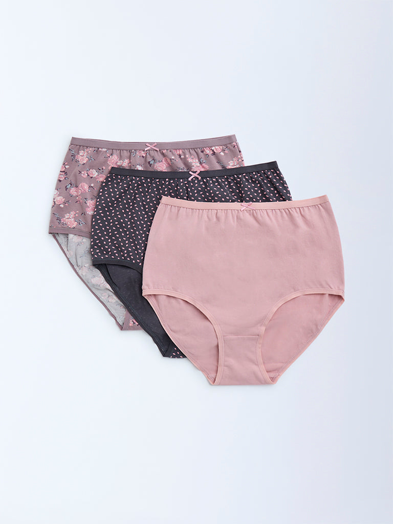 Revamp your lingerie rotation with this pack of three full briefs from Wunderlove. The set includes a mauve pair adorned with delicate floral prints. a dusty pink solid for everyday ease. and a charcoal variant decorated with botanical motifs. Made from a soft cotton-blend fabric. each brief is finished with a smooth elastic waistband for a secure fit and all-day comfort.