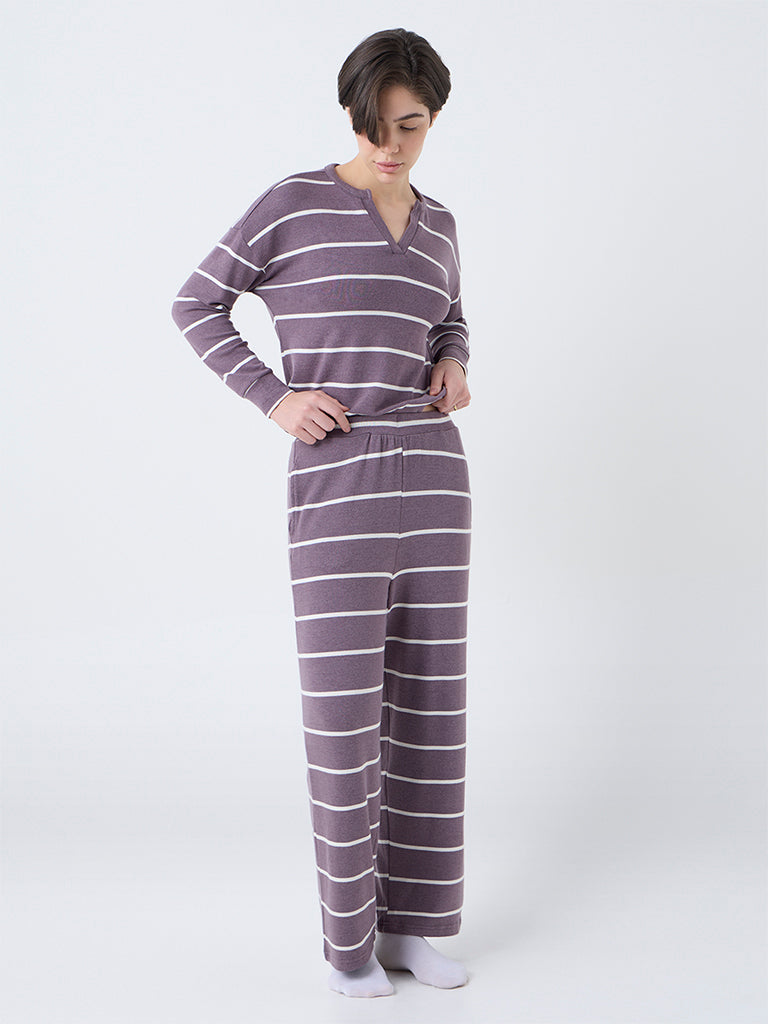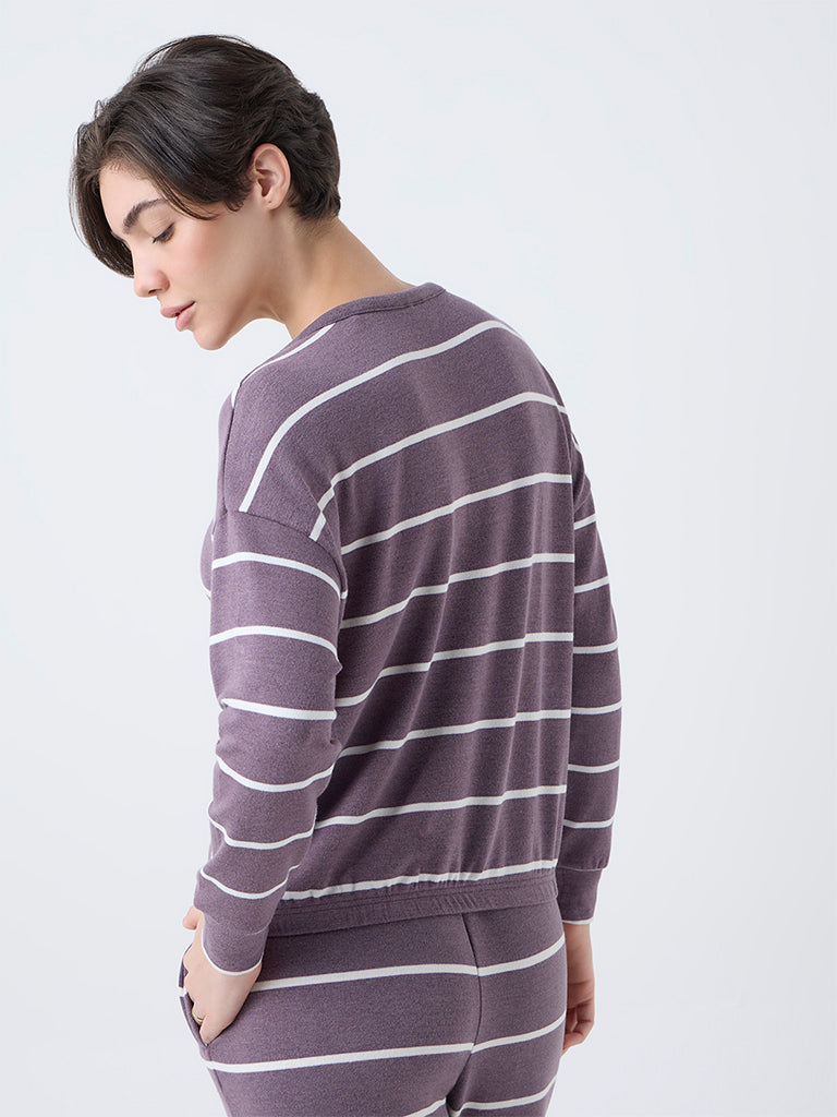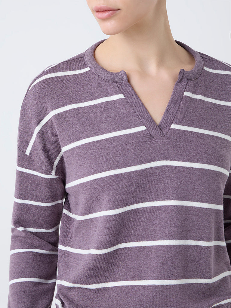 Sit comfortably and poised in this mauve top by Wunderlove. exhibiting stripe prints for a timeless appeal. Woven from soft. sumptuous fabric. it is framed with a notch neck and drop shoulder sleeves for an easy silhouette.