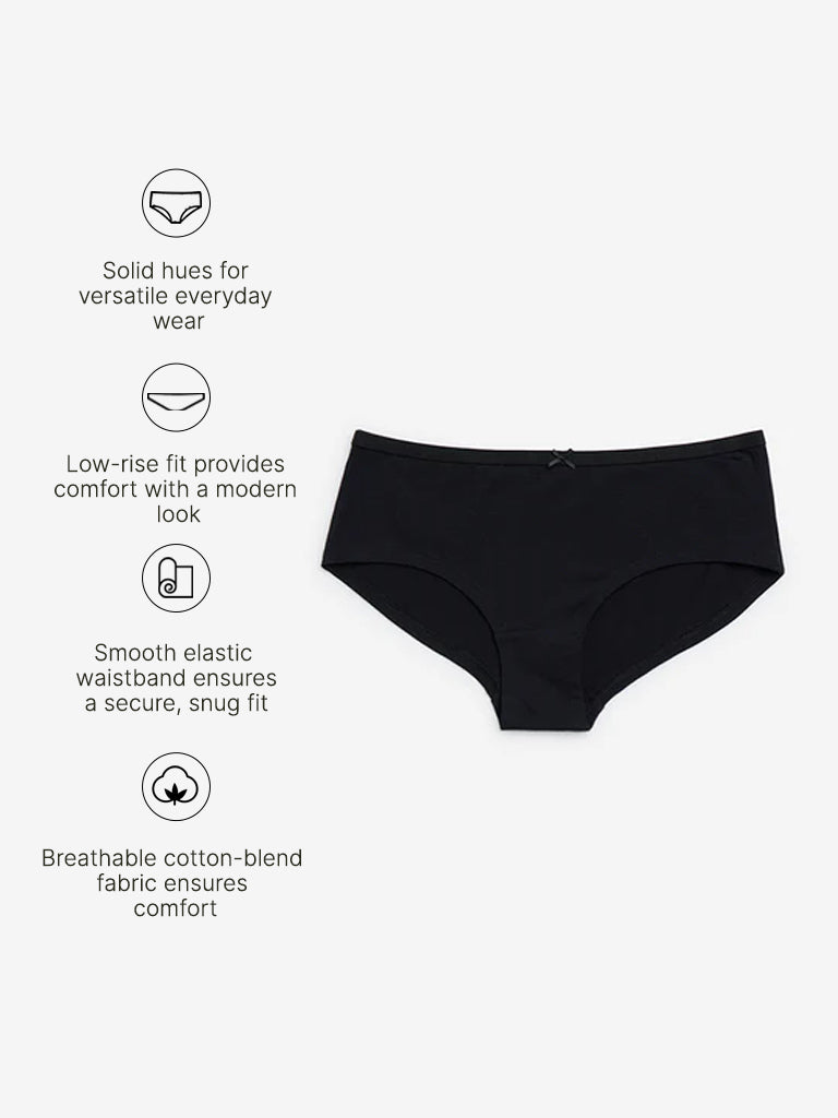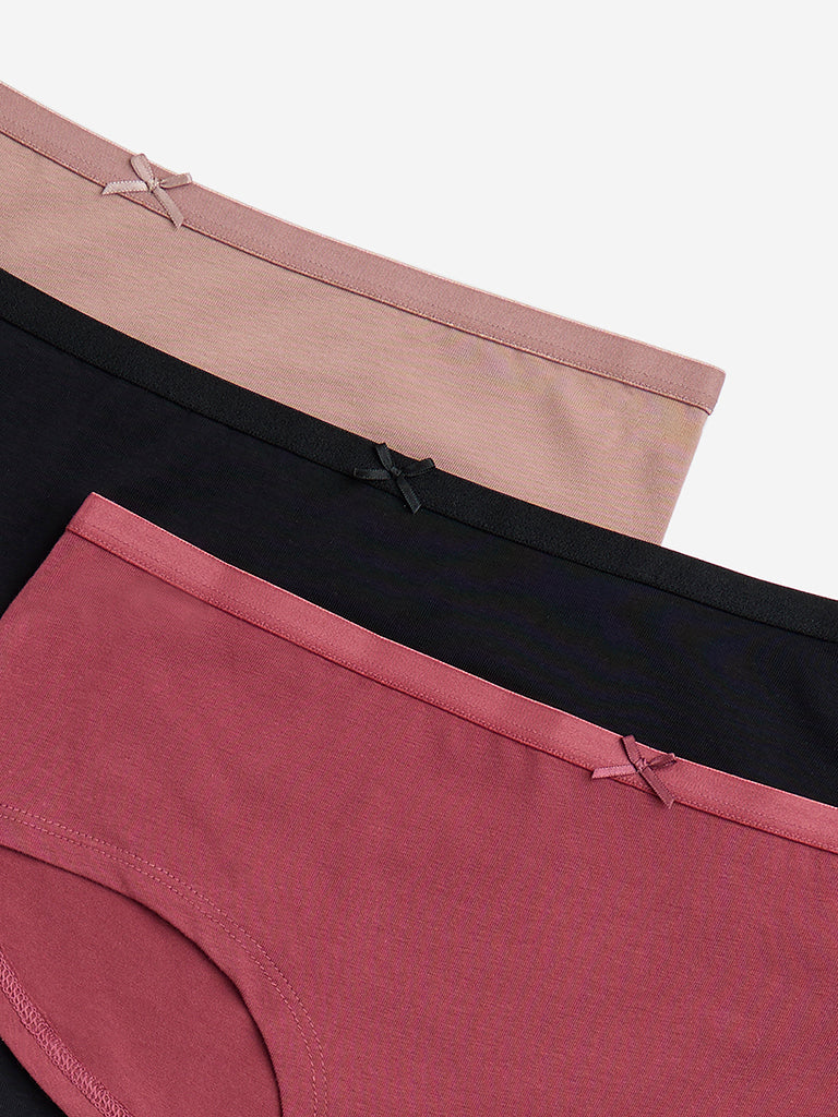 Wunderlove introduces this set of briefs in three solid shades—black. magenta. and dusty rose. Crafted from a soft cotton-blend fabric for all-day comfort. each piece is designed in a flattering low-rise fit. A smooth elastic waistband ensures a flexible feel. while a delicate bow detail adds a touch of charm.