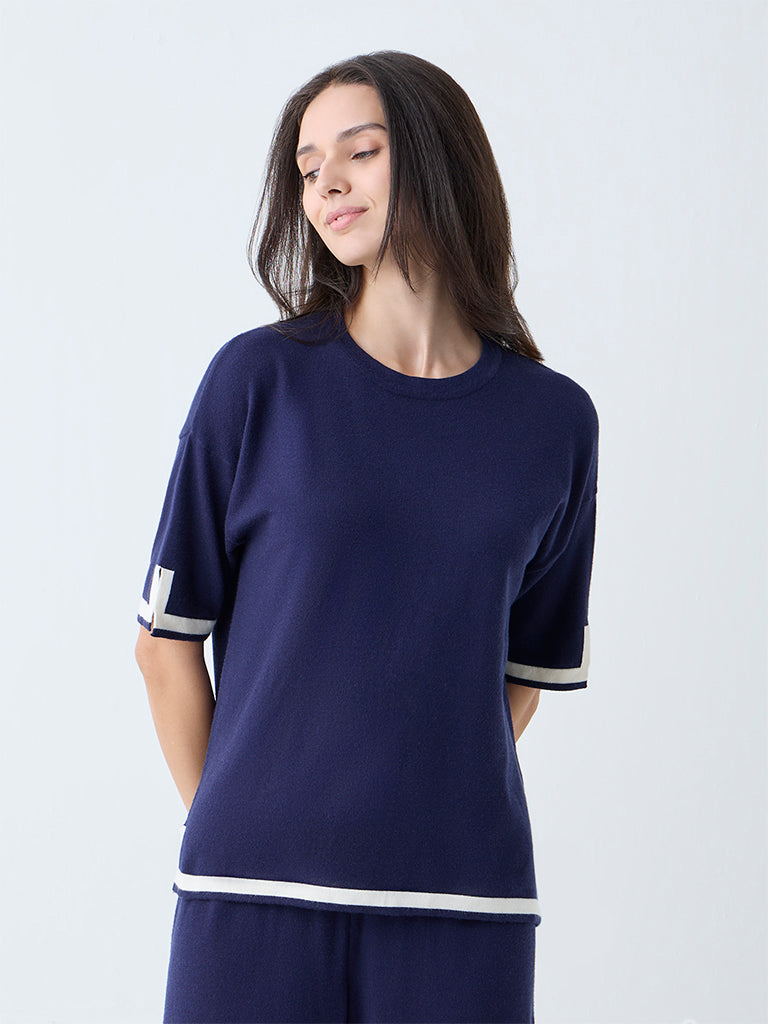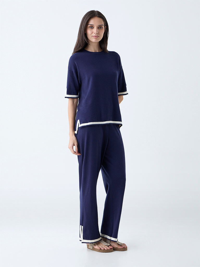 Unwind in style with this navy t-shirt from Wunderlove. designed for comfort without compromising on polish. Constructed from high-quality fabric. it features a round neck and dropped sleeves. while contrast detailing along the hemline lends a modern finish.