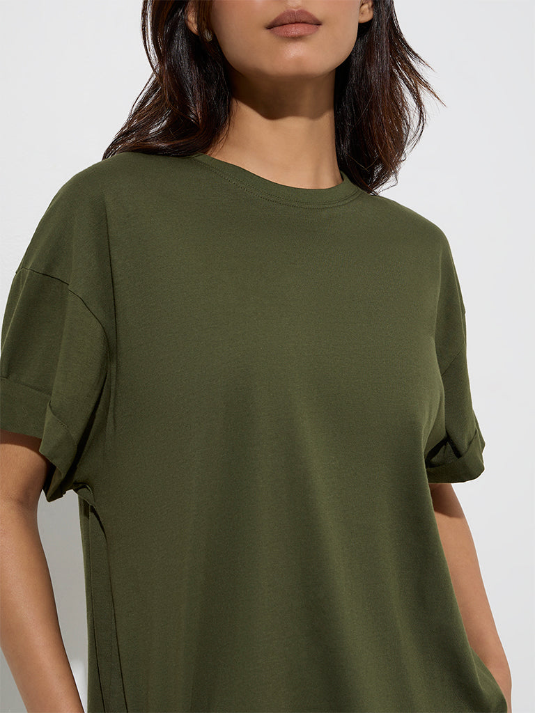 This olive top from Wunderlove is fashioned in a minimalistic profile with clean. easy lines. Milled from pure cotton for easy comfort. it is finished with a round neck and dropped sleeves with upturned hems.
