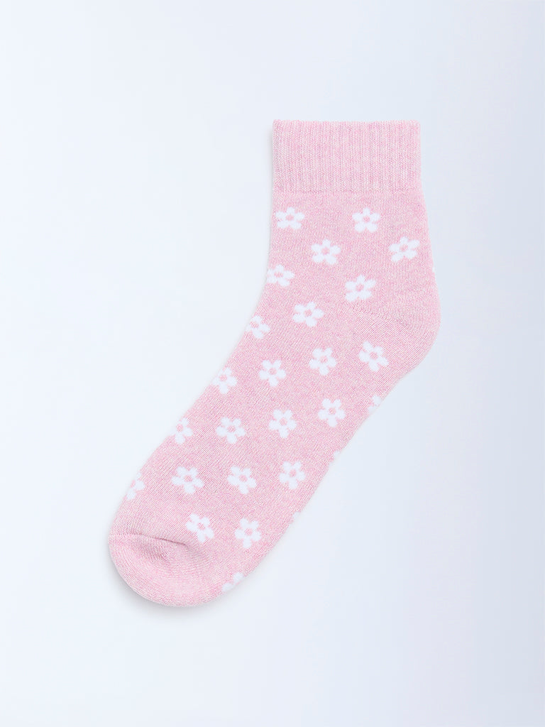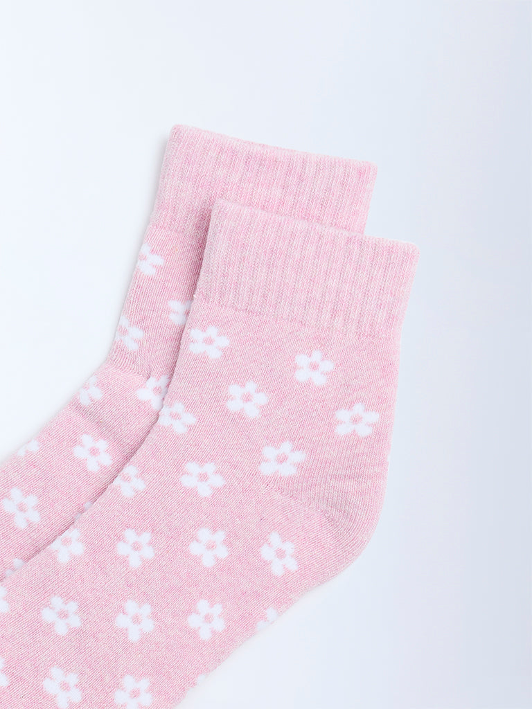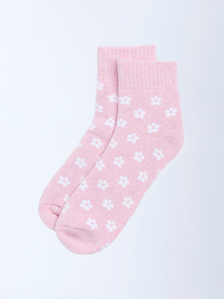 Wunderlove Pink Floral Printed Cotton-Blend Ankle Socks