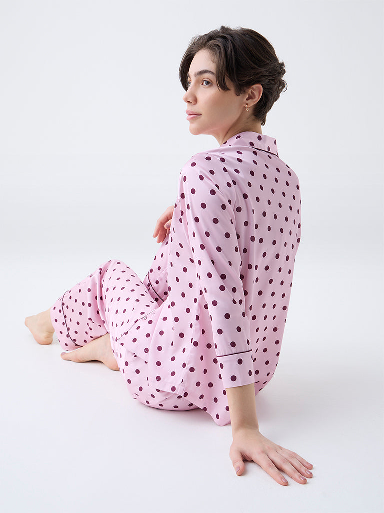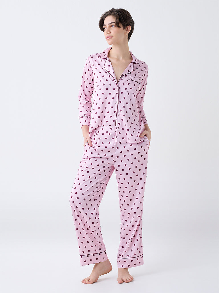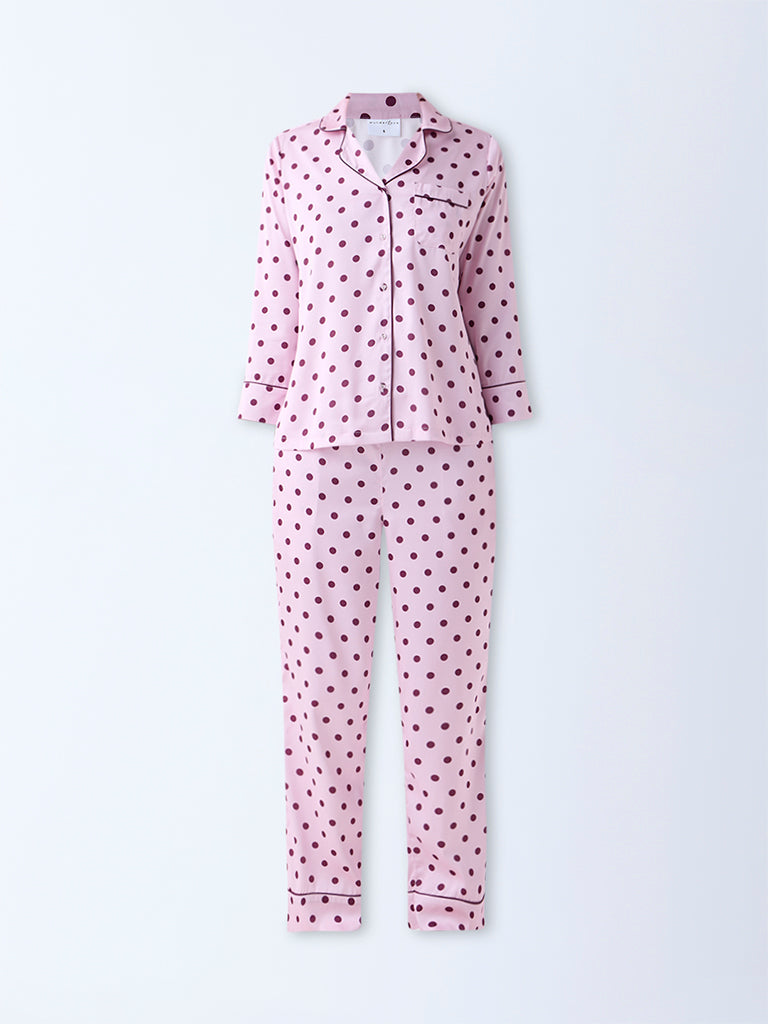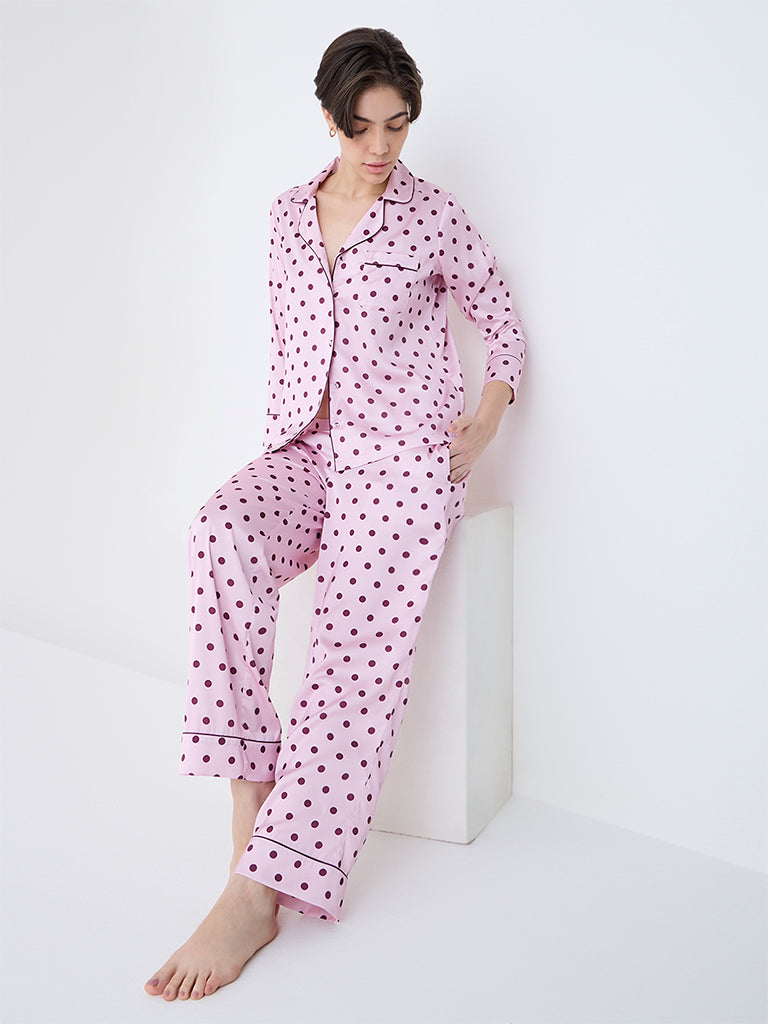 Wunderlove elevates everyday comfort with this pink set. defined by an all-over polka dots pattern on a premium-blend fabric. delivering a smooth and breathable feel. The shirt features a notched collar. three-quarter sleeves. a button-up front and a patch pocket. it pairs with high-rise pyjamas detailed with an elasticated waistband and side pockets for a coordinated finish.