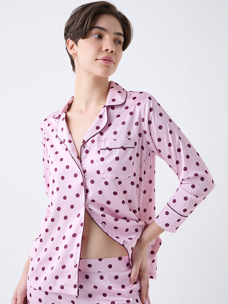Wunderlove Pink Polka Dotted Satin Shirt with Pyjamas Set