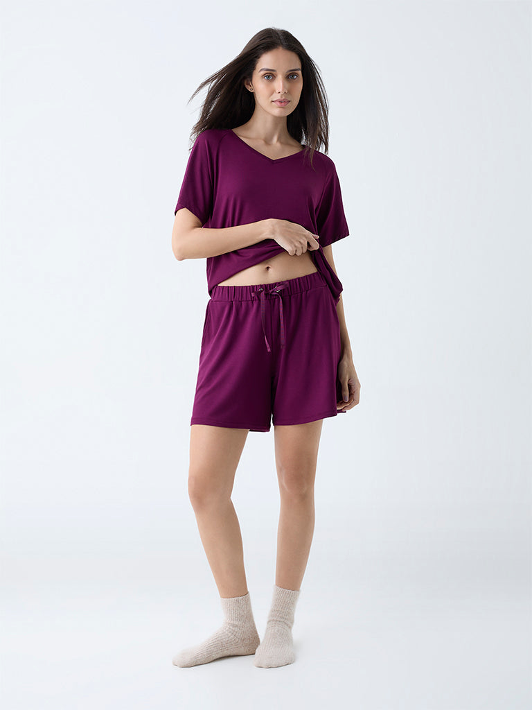 Make lounging feel a little more luxe with these purple shorts from Wunderlove. Milled from a super-soft fabric. they feature a high-rise fit with an elastic waistband and drawstring for comfort that adjusts to you. Finished with side pockets for everyday ease. they’re a chic yet relaxed pick for slow mornings and laid-back evenings.