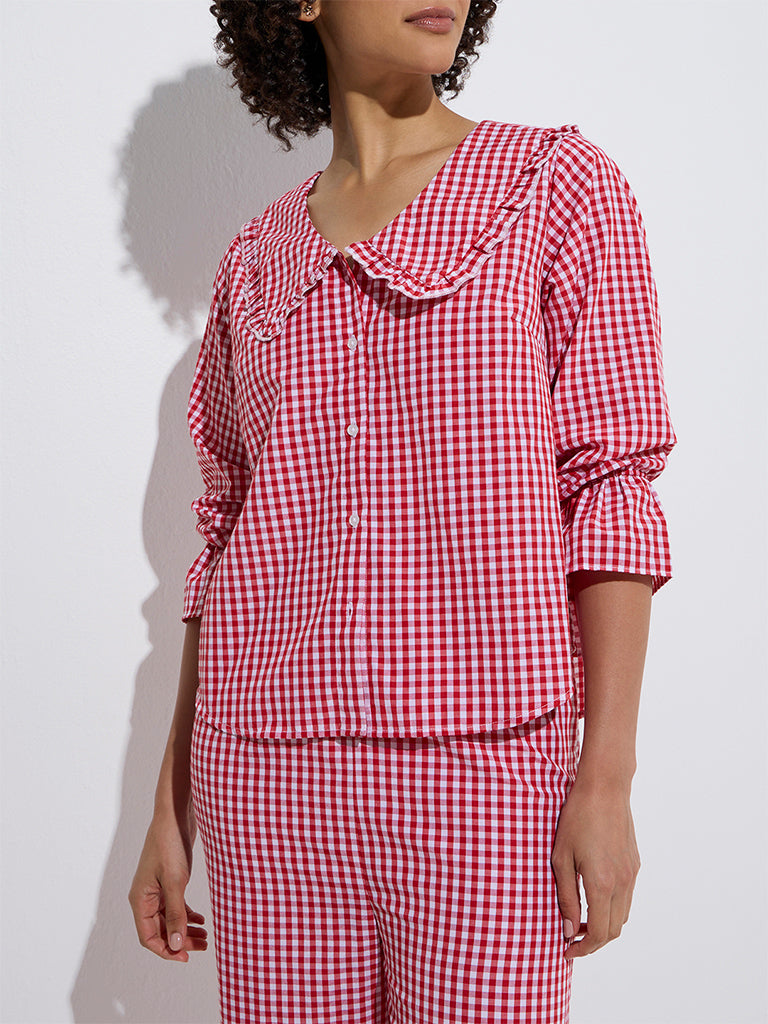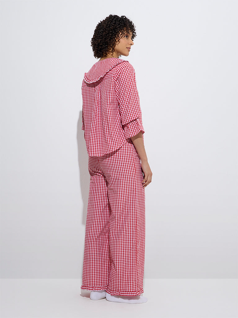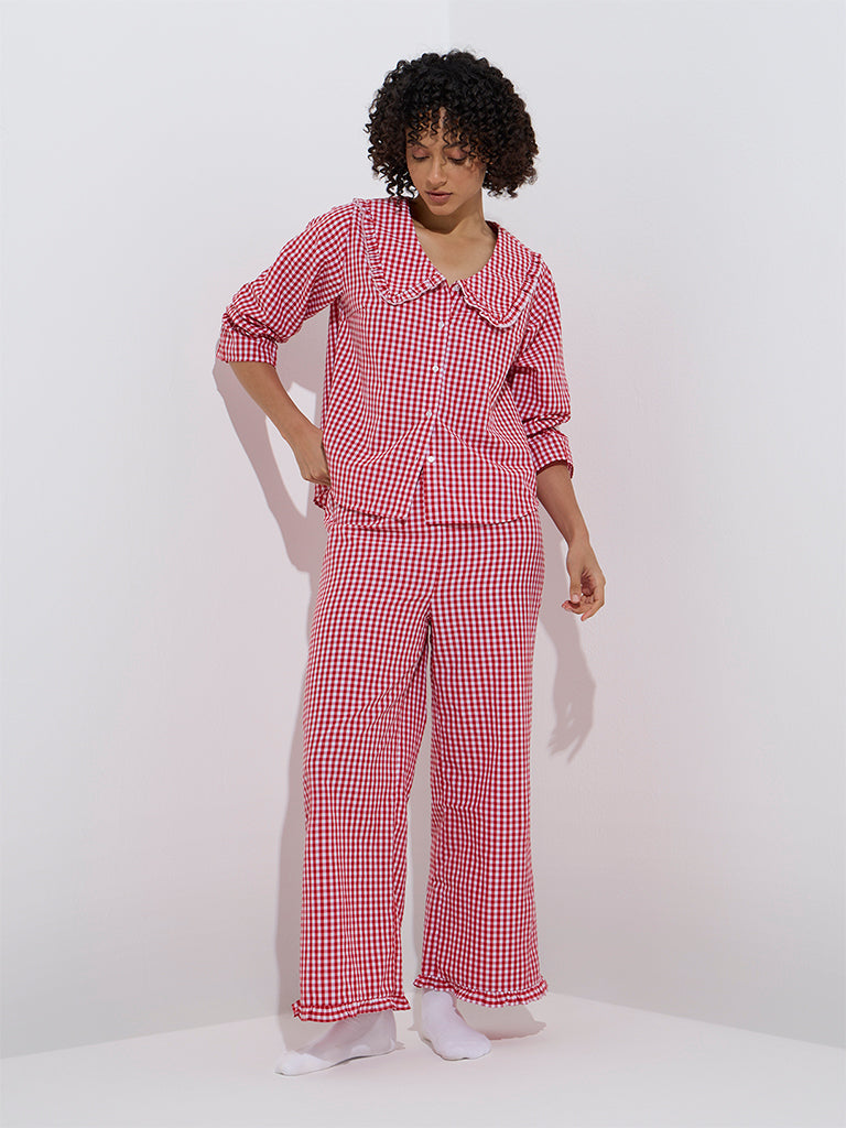 This red loungewear set from Wunderlove brings a playful charm to your downtime wardrobe with its gingham checkered design. The shirt is styled with a relaxed silhouette. featuring a Peter Pan collar and flute sleeves. Paired with coordinated pyjamas featuring an elasticated drawstring waistband and ruffled hems. this set blends comfort with feminine flair.